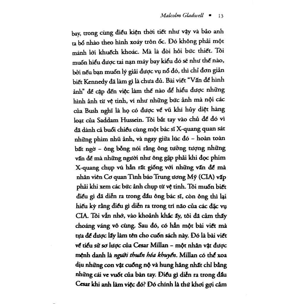 GIỚI THIỆU SÁCH : Chú Chó Nhìn Thấy Gì? (Tái Bản ) Có cấu trúc và giọng văn cân nhắc chỉn chu, song bạn sẽ thấy 19 bài viết trong cuốn sách này đề cập đến những khía cạnh hoàn toàn khác nhau của cuộc sống từ việc: "Mù tạt giờ đây xuất hiện với cả tá chủng loại. Vì đây ketchup vẫn nguyên xi y dạng?" "Những điều về sức khỏe phụ nữ mà cha đẻ của thuốc ngừa thai không hề biết" "Cuộc sống của một người có đáng bị hủy hoại chỉ vì lời buộc tội đạo văn?"... Mỗi bài viết điều có khả năng thu hút bạn, khiến bạn phải ngẫm nghĩ, hay đem lại cho bạn ý niệm lờ mờ nào đó về trí não của kẻ khác". Hãy đọc và cùng khám phá những cuộc phiêu lưu của Gladwell để hiểu rõ hơn những hiện tượng xung quanh bạn, qua đó bồi đắp thêm kinh nghiệm sống cho bản thân. Cuốn sách chia làm ba phần: Phần thứ nhất: Những kẻ ám ảnh, những người tiên phong và những kiểu thiên tài nhỏ lẻ khác Phần thứ hai: Những luận thuyết, tiên lường và chuẩn đoán Phần thứ ba: Nhân phẩm, tính cách và trí tuệ