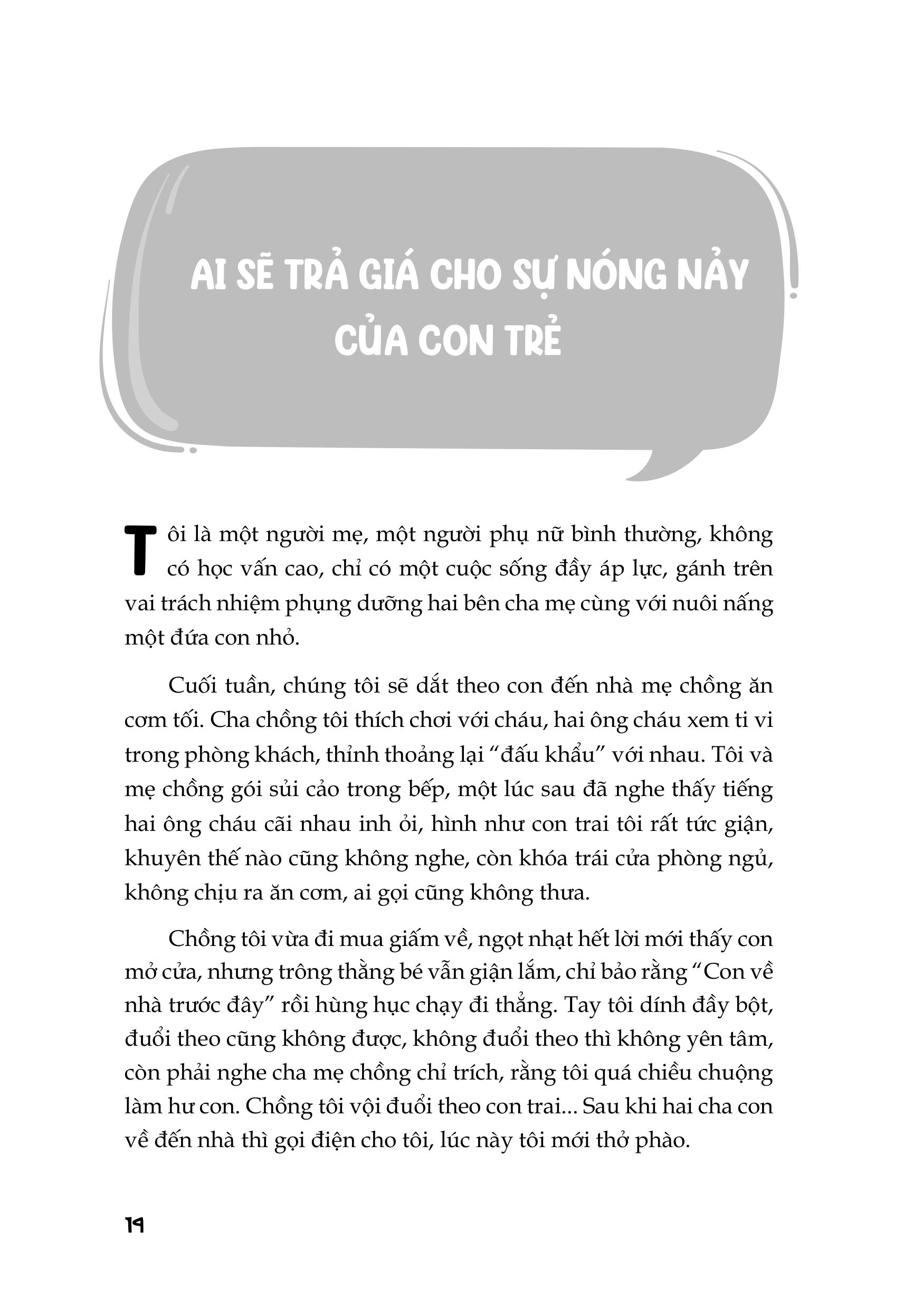 Sự tức giận ở trẻ em là một thử thách đầy mệt mỏi. Cơn giận dữ của một đứa trẻ có thể mang đến cho cha mẹ nhiều giây phút căng thẳng và nặng nề. Là cha mẹ, chúng ta lo lắng và đôi khi trong lúc tuyệt vọng, chúng ta nói cũng nhưlàm những điều mà trước khi có con chúng ta không bao giờ tưởng tượng được ra... Việc phải đối mặt với một đứa trẻ giận dữ là một thử thách to lớn Xử lí sự tức giận là việc cực kì khó. Trẻ con tức giận rất khó giải quyết. Thật mệt mỏi khi phải đối phó với những cơn phẫn nộ triền miên, nhất là khi cha mẹ bị quá tải với hàng đống việc cần hoàn thành mỗi ngày. Khi một đứa trẻ tức giận và hung hăng, cha mẹ cũng có thể thấy lo lắng về tương lai của đứa trẻ đó. Một điều khiến cho vấn đề trở nên phức tạp hơn là sự tức giận không bao giờ xuất hiện đơn lẻ. Một đứa trẻ có thể luân phiên giữa tức giận và buồn bã, giữa tức giận và xấu hổ. Thậm chí có thể vừa tức giận vừa vui sướng. Nhưng phản ứng cảm xúc của cha mẹ vẫn xảy ra bất chấp thực tế là đằng sau sự tức giận, trẻ có thể đang bị tổn thương. Khi bị dồn đến giới hạn chịu đựng, chúng ta phản ứng lại sự tức giận của con bằng cách trở nên tức giận. Sau đó, có thể chúng ta sẽ chỉ trích, chế nhạo, xa lánh con hoặc buông xuôi. Sự tức giận của con cái cũng có thể khiến chúng ta tuyệt vọng. Giải pháp là biết nhiều hơn về cơ chế của sự tức giận Đằng sau hành vi hung hãn thường ẩn giấu cảm giác dễ tổn thương. Một đứa trẻ giận dữ thường là một đứa trẻ đang bối rối, xấu hổ, thất vọng haojwc cảm thấy mình nhỏ bé, ngu ngốc hay kém cỏi. Sự tức giận của trẻ có thể là biểu hiện của nỗi buồn, sự cô đơn hoặc sợ hãi. Là người lớn, bạn cần cảm nhận thức được cơn giận dữ cực đoan của trẻ có thể gợi lên trong bạn cảm xúc gì, và bạn cần được hỗ trợ để biết cách kiểm soát cảm xúc của chính mình - những cảm xúc có thể ngăn cản bạn thực hiện nhiệm vụ quan trọng là trở thành điểm tựa tinh thần cho con. Cuốn sách này cung cấp cho bạn tất cả những gì cần biết về sự tức giận và hung hăng của con mình Cuốn sáchTrẻ Cáu Cha Mẹ Gắtsẽ làm sáng tỏ sự tức giận, nhắc nhở mọi người lí do tại sao nó lại là một cảm xúc quan trọng và cần thiết. Sự tức giận có một vai trò xã hội rất quan trọng giúp chúng ta tạo ta các ranh giới và bảo vệ chính mình. Cuốn sách này cung cấp cho bạn tất cả những gì cần biết về sự tức giận và hung hăng của con mình. Trọng tâm của cuốn sách không phải là cho con bạn bất cứ thứ gì chúng muốn, cũng không phải là dung túng cho những hành vi hung hãn. Mà sẽ chỉ cho bạn một cách tiếp cận mới để duy trì ranh giới lành mạnh có thể giúp bạn thiết lập các giới hạn một cách hiệu quả, đồng thời hiểu được cảm xúc của con mình. Bạn cần nhớ rằng, việc hiểu được cảm xúc của bản thân và con cái là chìa khóa giúp bạn thành công khi thiết lập các giới hạn.