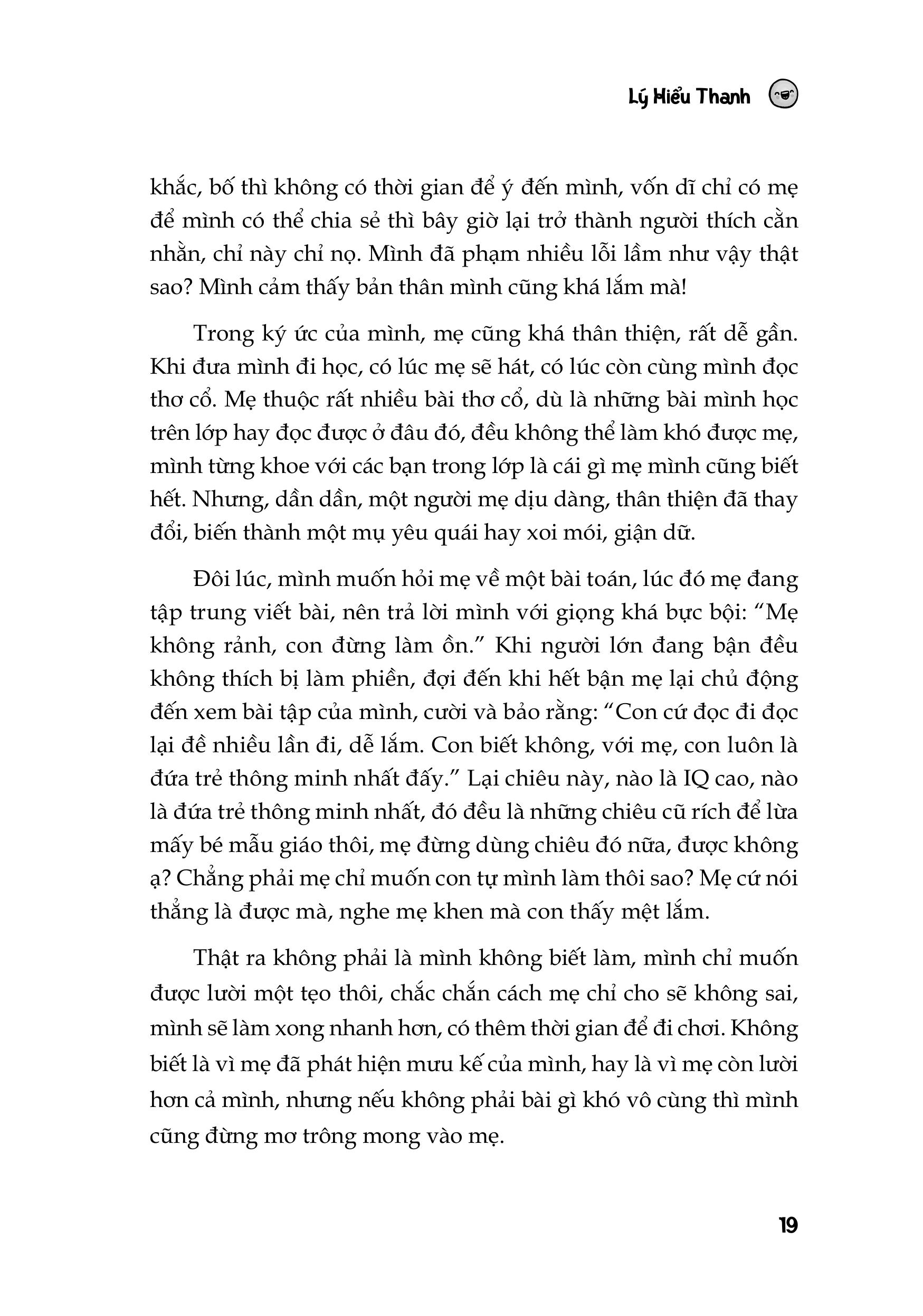 - Bản Kiểm Điểm Của Mẹ Cuốn sách "Bản Kiểm Điểm Của Mẹ" là một tác phẩm đầy cảm hứng và sâu sắc, dành cho những người mẹ đang tìm kiếm sự tự nhận thức và cải thiện mối quan hệ với con cái. Tác giả của cuốn sách này đưa ra những quan điểm về cách mà mỗi người mẹ có thể tự đánh giá và nhìn nhận lại chính mình trong hành trình làm mẹ. Cuốn sách không chỉ là một bài học về cách chăm sóc con cái mà còn khuyến khích người mẹ tự kiểm điểm về những cảm xúc, hành động, và thái độ của mình trong quá trình nuôi dạy con. Thông qua các câu hỏi kiểm điểm, các bài học chia sẻ từ kinh nghiệm thực tế, cuốn sách khơi gợi người mẹ nhận ra những điểm mạnh và yếu trong bản thân mình, từ đó có thể cải thiện cách thức nuôi dạy con cái sao cho hiệu quả hơn. Đặc biệt, cuốn sách còn giúp người mẹ nhận thức được sự ảnh hưởng mạnh mẽ của chính bản thân đối với sự phát triển của con trẻ. Nó không chỉ là một cuộc hành trình tự khám phá mà còn là một công cụ để người mẹ hiểu rõ hơn về vai trò quan trọng của mình trong việc hình thành nhân cách và thế giới quan của con cái. "Bản Kiểm Điểm Của Mẹ" là một cuốn sách rất hữu ích đối với những người mẹ mong muốn hoàn thiện bản thân trong vai trò người nuôi dạy con cái, đồng thời cũng mang lại một góc nhìn sâu sắc về tình mẫu tử và sự phát triển gia đình. MỘT SỐ HÌNH ẢNH THAM KHẢO CAM KẾT