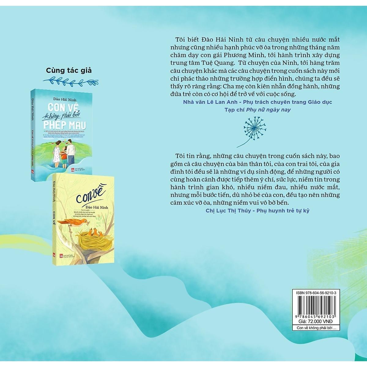 Thông tin sản phẩm Mã hàng 978656921 Tên Nhà Cung Cấp Phụ Nữ Tác giả Đào Hải Ninh NXB NXB Phụ Nữ Việt Nam Năm XB 2020 Trọng lượng (gr) 150 Kích Thước Bao Bì 20.5 x 13.5 x 1.2 cm Số trang 216 Hình thức Bìa Mềm Bộ sách 2 cuốn Con về và Con về không phải phép màu là những cuốn sách được ghi lại từ trải nghiệm của chính người trong cuộc là cha mẹ có con tự kỷ – Đào Hải Ninh và những người bạn đồng hành. 15 năm trước, chị Đào Hải Ninh là một người phụ nữ của công việc đầy năng động, chị làm trong lĩnh vực tài chính ngân hàng và có vị trí nhiều người mơ ước. Chị luôn là người người tự tin, chủ động lập kế hoạch cho nhưng bước tiến của cuộc đời mình. Ngay cả việc sinh con chị cũng lên kế hoạch kĩ càng và cầu toàn với kết quả như mong đợi, một gia đình thành đạt vợ chồng đều có địa vị trong xã hội với hai đứa con đủ nếp đủ tẻ. Cuộc sống của chị cứ thuận lợi như vậy cho đến khi cô con gái thứ 2 của chị sau những tiếng bi bô đầu đời rồi rơi vào “câm” hẳn - con không thể phát ra âm thanh và thường xuyên có những biểu hiện của trẻ tăng động. Chị vẫn cho đó là bình thường, con chị có thể chỉ chậm nói mà thôi, cho đến khi một người bạn là bác sĩ đến nhà chơi dè dặt nói với chị vì sự bất bình thường của con mình, chị không tin con mình không bình thường. Đến tận lúc cầm kết quả kiểm tra của con gái với chẩn đoán của bác sĩ, con chị là trẻ tự kỷ với điểm 41/50 (theo thang điểm CARS) và được xác định là “không thể phục hồi”, chị mới cay đắng nhận ra rằng con mình mắc “bệnh” không giống ai, “bệnh” không chữa “bệnh” không bao giờ khỏi. Mặc dù biết “không có nhiều hy vọng” nhưng với tâm lý, còn nước còn tát, ai mách nào tốt, chỗ nào hay chị mua cho con và không tiếc tiền đưa con đi đều đưa con đi can thiệp tại những trung tâm hỗ trợ trẻ tự kỷ nổi tiếng nhất. Đỉnh điểm cho đến một lần trong một trung tâm can thiệp trẻ tự kỉ, sau 3 ngày chỉ xin được phép nấp dưới gầm bàn để được nhìn cô điều dưỡng tập cho con mình với mong muốn sau đó về tự tập cho con, là 3 ngày chị phải nghiến răng chịu đựng cảnh cô điều dưỡng “huấn luyện” con ngồi trên ghế. Con chị phản ứng mạnh ngửa đầu đập “côm cốp” vào thành ghế nhưng cô vẫn điểm nhiên quát “ngồi yên”, trái tim người mẹ không thể chịu nổi cảnh đó đã lên tiếng xin cô cho con đồ chơi, cô điều dưỡng nói lạnh lùng nói với chị “bọn này phải thế”. Trái tim người mẹ trào lên một sự đau đớn, trời ơi, chị nhận ra người ta không coi con chị là một con người và không đối xử với những đứa trẻ như con chị như một con người. Chị như bừng tỉnh và giật lại đứa con, ôm con vào lòng, đứa trẻ đang hoảng sợ gục đầu vào ngực mẹ, giây phút ấy chị biết con chị nhận ra mẹ, chỉ có chị có thể là chỗ dựa cho con. Chị đi đến quyết định, chị sẽ là người đồng hành cùng con, chỉ có người mẹ mới có thể đưa con trở về, chị không thể phó mặc núm ruột của mình bất kỳ ai, bất kỳ trung tâm nào dù người ta nói về nó hay đến bao nhiêu. Hành trình đồng hành cùng con, có được có mất, có cả “đánh đổi”, mà như chị nói đó là sự “lựa chọn”, chị lựa chọn bên con, lựa chọn đồng hành cùng con vượt qua chứng tự kỉ trở lại với cuộc sống bình thường mặc dù chị cũng phải đánh đổi, đó là lựa chọn từ bỏ công việc yêu thích và có cơ hội thăng tiến, thậm chí ngay cả khi hạnh phúc gia đình không trọn vẹn chị vẫn chỉ nhận về mình những đứa con. Khi đã quyết tâm chị có thể buông bỏ tất cả để đồng hành cùng con. Con gái Phương Minh của chị từ một cô bé tự kỉ dạng nặng với đầy đủ những biểu hiện điển hình của trẻ tự kỷ. Với bước đi nhón chân, dang tay như chim cánh cụt, nên con không giữ được thăng bằng thường xuyên vấp ngã, da bị lở loét. Nguy hiểm hơn là con không hề biết đến thế nào là nguy hiểm sẵn sàng bất chợt lao ra đường và ngay cả khi bị xe đâm trầy xước chảy máu lại càng khiến con thích thú. Trò chơi con thích là bắt hơi nước từ nồi cơm điện khiến con thường xuyên bị bỏng, nhưng dù có ấn tay vào vết đau con cũng không có phản xạ. Chị đã kiên trì tập cùng con tập vật lý trị liệu, hằng ngày dõi theo phản ứng của con để đưa ra một giáo án phù hợp theo từng ngày cùng cô giáo dục đặc biệt. Thậm chí có khi để con biết đến sự nguy hiểm chị còn phải lấy chính mảnh vỡ chiếc cốc con vừa làm vỡ đâm vào tay mình cho chảy máu và phết lên tờ giấy rồi khóc để con biết như thế là nguy hiểm. Hay khi đã là một cô bé đến tuổi dậy thì, Phương Minh vẫn hồn nhiên mặc độc chiếc quần chíp và chiếc áo dài để đi gội đầu. Chị lại phải kiên trì dạy con về giới tính. Rồi khi con chống đối, đưa ra các hành động kì quặc ph