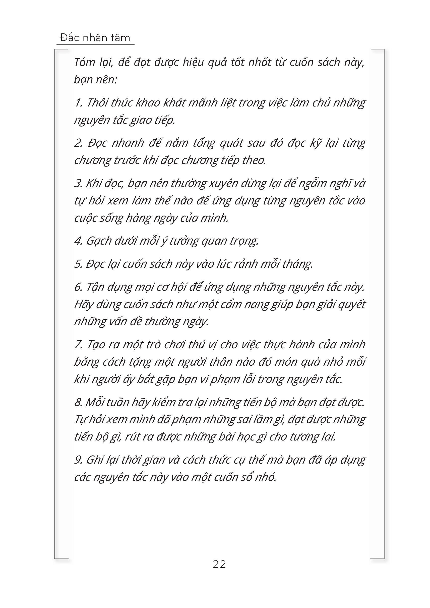 - Năm xuất bản: 2024 GIỚI THIỆU SẢN PHẨM Nếu bạn còn lúng túng mỗi khi trò chuyện thì cuốn sách Đắc Nhân Tâm của tác giả Dale Carnegie chính là những gì bạn cần. Mỗi trang sách đúc kết kinh nghiệm từ bậc thầy giao tiếp sẽ mở ra những góc nhìn thú vị về tâm lý - hành vi của con người dưới tác động của ngôn từ. Các nguyên tắc trong đây sẽ là chìa khoá giúp cho cuộc sống của bạn trở nên hạnh phúc, thành công hơn. Đây là quyển sách duy nhất về thể loại self-help liên tục đứng đầu danh mục sách bán chạy nhất (best-selling Books) do báo The New York Times bình chọn suốt 10 năm liền và đã được dịch ra hơn 50 ngôn ngữ khác nhau Riêng bản tiếng Anh của sách đã bán được hơn 15 triệu bản trên thế giới. Tác phẩm có sức lan toả vô cùng rộng lớn - dù bạn đi đến bất cứ đâu, bất kỳ quốc gia nào cũng đều có thể nhìn thấy. Tác phẩm được đánh giá là quyển sách đầu tiên và hay nhất, có ảnh hưởng làm thay đổi cuộc đời của hàng triệu người trên thế giới. Đắc nhân tâm và cái Tài trong mỗi người chúng ta. Đắc Nhân Tâm trong ý nghĩa đó cần được thụ đắc bằng sự hiểu rõ bản thân, thành thật với chính mình, hiểu biết và quan tâm đến những người xung quanh để nhìn ra và khơi gợi những tiềm năng ẩn khuất nơi họ, giúp họ phát triển lên một tầm cao mới. Đây chính là nghệ thuật cao nhất về con người và chính là ý nghĩa sâu sắc nhất đúc kết từ những nguyên tắc vàng của Dale Carnegie. SƠ LƯỢC VỀ NỘI DUNG Cuốn sách bao gồm 4 phần giúp cho mỗi cá nhân sẽ có thể hiểu được nguyên tắc cơ bản về nghệ thuật ứng xử, giúp người khác yêu mến, ủng hộ quan điểm cũng như giúp bạn trở thành một nhà lãnh đạo tài ba. Phần 1: Nguyên tắc cơ bản trong nghệ thuật ứng xử Phần 2: 6 các khiến cho người khác yêu mến bạn Phần 3: Làm sao để người khác ủng hộ quan điểm của bạn Phần 4: Trở thành nhà lãnh đạo: thay đổi quan điểm của người khác mà không vấp phải sự phản bác MỘT SỐ HÌNH ẢNH NỘI DUNG THAM KHẢO CAM KẾT