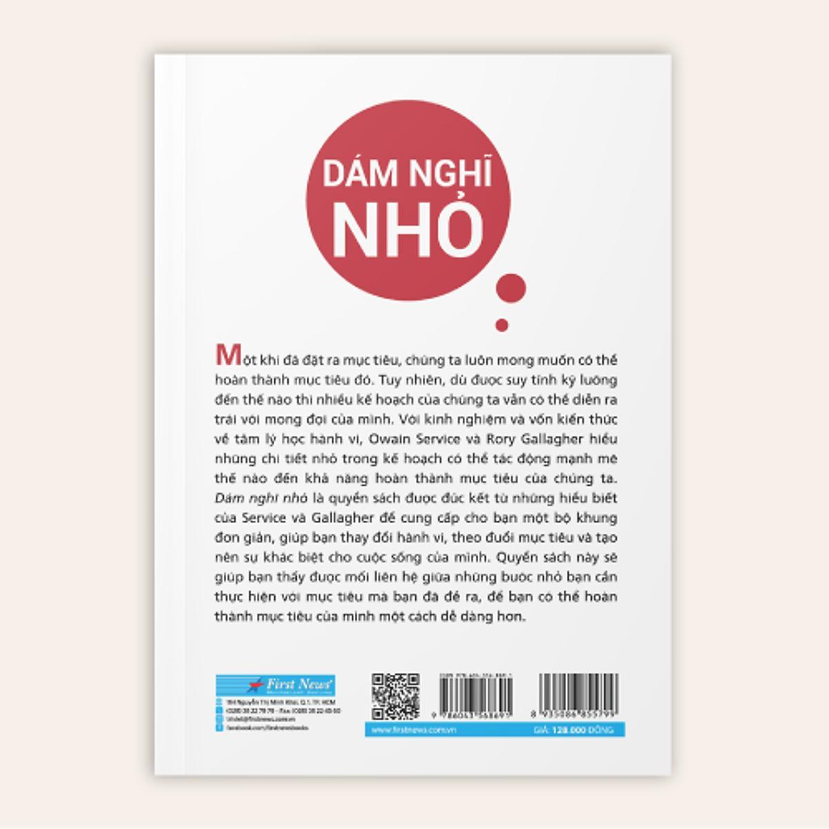 - Kiên trì theo đuổi Mỗi bước trong bộ khung hành vi này đều chứa đựng ba nguyên tắc được các tác giả giải thích rất cặn kẽ, đơn giản và dễ áp dụng. Khi lựa chọn mục tiêu, chúng ta cần xác định được tầm quan trọng của từng mục tiêu, từ dài hạn đến ngắn hạn, cũng như thấy được sự tương quan giữa các mục tiêu. Một khi đã nhắm được đích đến, chúng ta cần lập một kế hoạch “với những quy định rõ ràng và đơn giản để làm giảm nỗ lực nhận thức mà bạn phải bỏ ra khi theo đuổi mục tiêu”, và xây dựng thói quen hành động cho mục tiêu đó. Mục tiêu lớn hay nhỏ không quan trọng. Bạn có thể đặt mục tiêu lớn lao, nhưng đồng thời cũng hãy nghĩ về những bước nhỏ bạn cần thực hiện để tiến đến mục tiêu đó. Nếu có thể chuyển sự tập trung và khả năng chú ý của mình vào các thay đổi trong từng bước nhỏ, bạn sẽ tránh khỏi cái bẫy của lối mòn, thói quen và sự nản lòng trong quá trình theo đuổi mục tiê trọng là hãy luôn nhớ rằng bạn không hề đơn độc trên hành trình chinh phục mục tiêu. Hãy tìm kiếm sự giúp đỡ, nhận xét cũng như đánh giá của người khác về các thành quả của bạn, và bạn sẽ nhận ra mình có đang đi đúng hướng hay không. Điều cuối cùng và cũng quan trọng không kém là bạn phải kiên trì với những mục tiêu mà mình đã đặt ra. Điểm khác biệt của “Dám nghĩ nhỏ” so với những cuốn sách về khoa học hành vi khác là tính thiết thực, dễ đọc và dễ hiểu của nó. Tuy vận dụng những ý tưởng cũng như khái niệm phức tạp của khoa học hành vi, nhưng hai tác giả đã diễn giải các kiến thức hàn lâm bằng những từ ngữ quen thuộc. Các giải pháp được đưa ra đều rất dễ áp dụng, có cấu trúc chặt chẽ, mạch lạc và nhất quán ở cả bảy bước. Thêm vào đó, xuyên suốt cuốn sách là các tình huống cũng như câu chuyện có thật, gần gũi và sinh động để bạn có thể hình dung cụ thể hơn về bộ khung hành vi và lối tư duy “nghĩ nhỏ”. Với “Dám nghĩ nhỏ”, bạn sẽ có một cuộc sống lành mạnh hơn, ý nghĩa hơn và nhiều động lực hơn để không ngừng tạo ra những cú hích nhằm phát triển bản thân. Người nổi tiếng nói gì về cuốn sách “Một cuốn sách rất khác biệt về phát triển bản thân. Nó sẽ giúp nhiều người hoàn thành được những điều mà họ vẫn luôn muốn làm nhưng chưa thành công.”– The Times “Hài hước, thông minh và thiết thực, ‘Dám nghĩ nhỏ’ sẽ giúp bạn phát triển bản thân và làm việc hiệu quả hơn. Service và Gallagher đã thể hiện các ý tưởng phức tạp với một lối trình bày đơn giản, dễ tiếp thu.”– Cass Sunstein, đồng tác giả cuốn Nudge “Một cuốn sách tuyệt vời, bác bỏ lối suy nghĩ sáo mòn và cũ rích vẫn thường làm ta chệch hướng rằng: chỉ có những thay đổi lớn và táo bạo mới tạo ra được kết quả ấn tượng.”– Rory Sutherland, Phó Chủ tịch tập đoàn Ogilvy & Mather. Về tác giả Owain Service là giám đốc điều hành của Nhóm Nghiên cứu Hành vi (Behavioural Insights Team - BIT). Ông từng là phó giám đốc Đơn vị Chiến lược của Thủ tướng Chính phủ Vương quốc Anh và từng điều hành các chương trình về cải cách dịch vụ công, giáo dục và năng lượng. Rory Gallagher là giám đốc điều hành của BIT ở khu vực châu Á - Thái Bình Dương, có trụ sở tại Sydney (Úc). Ông từng làm việc trong Đơn vị Chiến lược của Thủ tướng Chính phủ Vương quốc Anh cùng Service và Bộ Giáo dục Anh. Nhóm Nghiên cứu Hành vi (Behavioural Insights Team - BIT), về sau còn được gọi là Đơn vị Hích (Nudge Unit) là một tổ chức được thành lập vào năm 2010 bởi chính phủ Anh, hay cụ thể là cựu thủ tướng Anh David Cameron. Phương châm hoạt động của BIT là: “Tránh xa cơ chế quan liêu của quá khứ, tìm ra những biện pháp thích hợp để khích lệ, hỗ trợ và tạo điều kiện để mọi người có thể đưa ra những lựa chọn tốt hơn cho chính họ”.