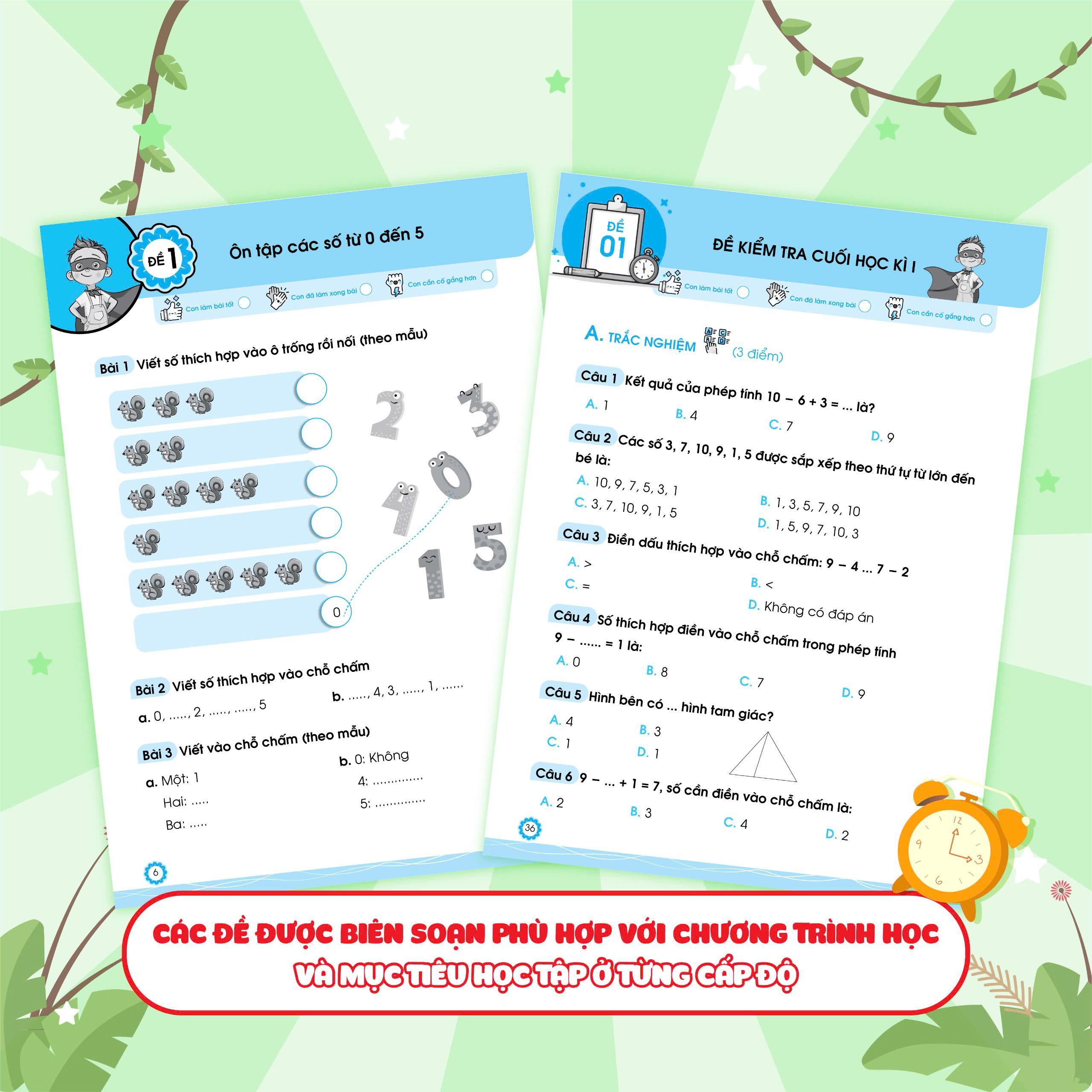 Đề ôn luyện và tự kiểm tra Toán lớp 1 tập 1 là một "trợ thủ" đắc lực giúp các em học sinh có thể tự ôn luyện sau mỗi giai đoạn học tập: ôn tập ngắn sau 2-3 tuần học, ôn tập giữa học kỳ và ôn tập cuối học kỳ - cuối năm học.