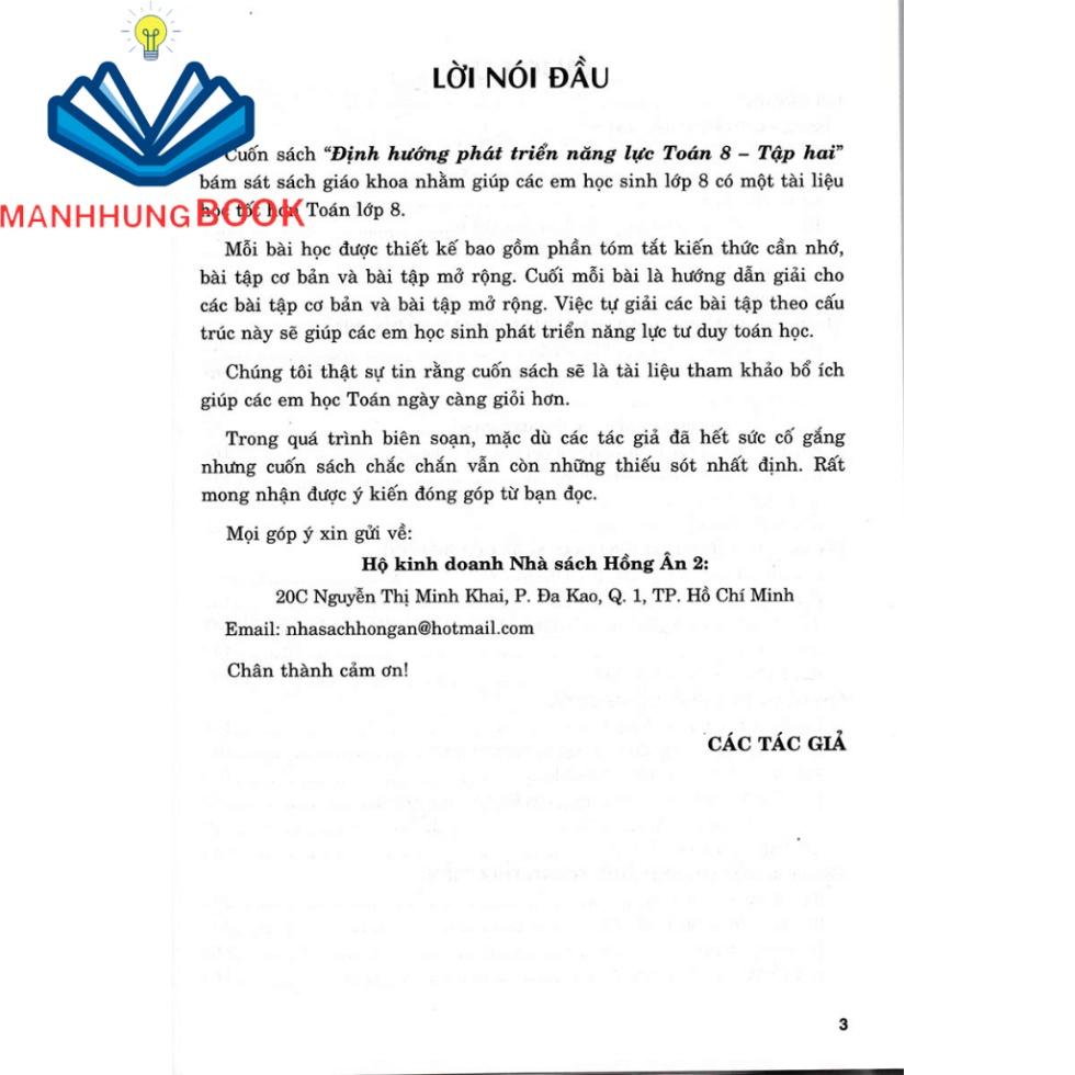 Cuốn sách “Định hướng phát triển năng lực Toán 8 – Tập hai” nhằm giúp các em học sinh lớp 8 có một tài liệu để học tốt môn Toán lớp 8.