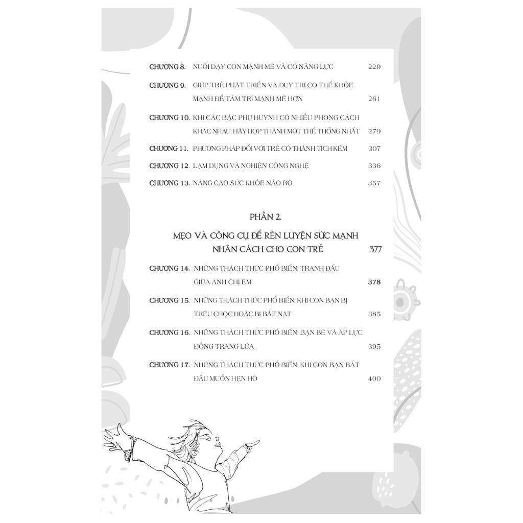 • Phần 2: Cung cấp các công cụ thực hành, tình huống điển hình và phương pháp xử lý các thách thức phổ biến trong quá trình trưởng thành: bị bắt nạt, áp lực bạn bè, sử dụng công nghệ quá mức, mâu thuẫn trong gia đình, lo âu xã hội, hay các khó khăn trong giai đoạn dậy thì và hình thành nhân cách. Các hướng dẫn đều được thiết kế dựa trên nguyên tắc tôn trọng – yêu thương – thiết lập giới hạn – trao quyền kiểm soát phù hợp cho trẻ. Điểm mạnh nổi bật của cuốn sách là tính ứng dụng cao, ngôn ngữ dễ hiểu, giàu ví dụ thực tiễn, có lồng ghép các bài tập rèn luyện tư duy và cảm xúc, phù hợp với bối cảnh giáo dục và văn hóa gia đình hiện đại.