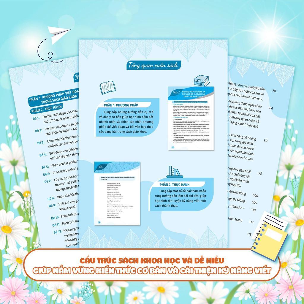 - Phương pháp viết đoạn và bài văn theo các dạng bài trong SGK: đưa ra những hướng dẫn tỉ mỉ, cụ thể cách viết đoạn văn ghi lại cảm xúc về một bài thơ 8 chữ và viết bài văn theo từng thể loại cụ thể (nghị luận xã hội, nghị luận văn học, thuyết minh, kịch).
