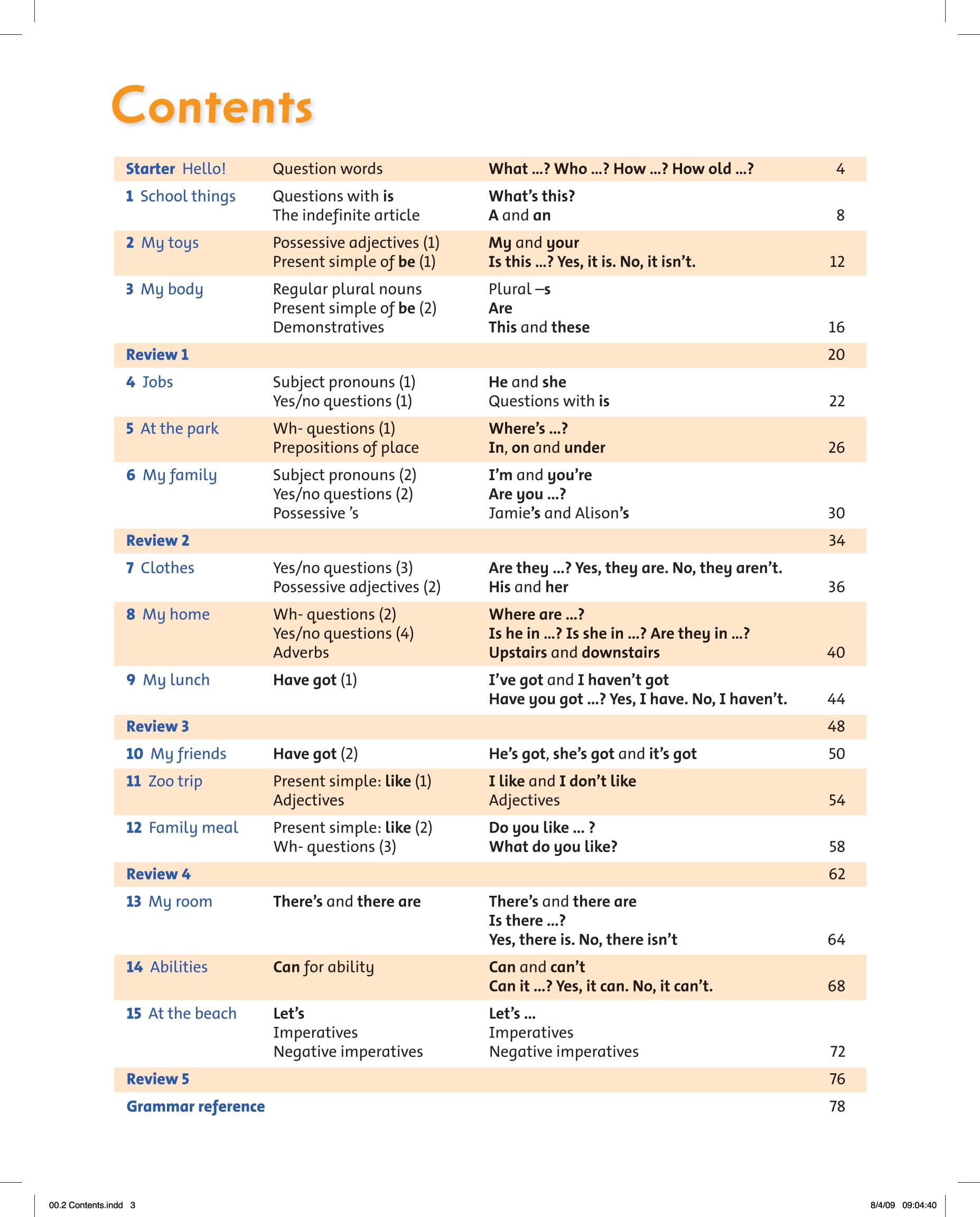 • Xây dựng nền tảng vững chắc để học các cấp độ ngữ pháp nâng cao hơn trong những cuốn tiếp theo của bộ Grammar Friends. Nội Dung Cuốn Sách Grammar Friends 1 Grammar Friends 1 gồm 15 bài học chính, được chia theo các chủ đề thông dụng, gần gũi với cuộc sống hàng ngày của học sinh tiểu học như: