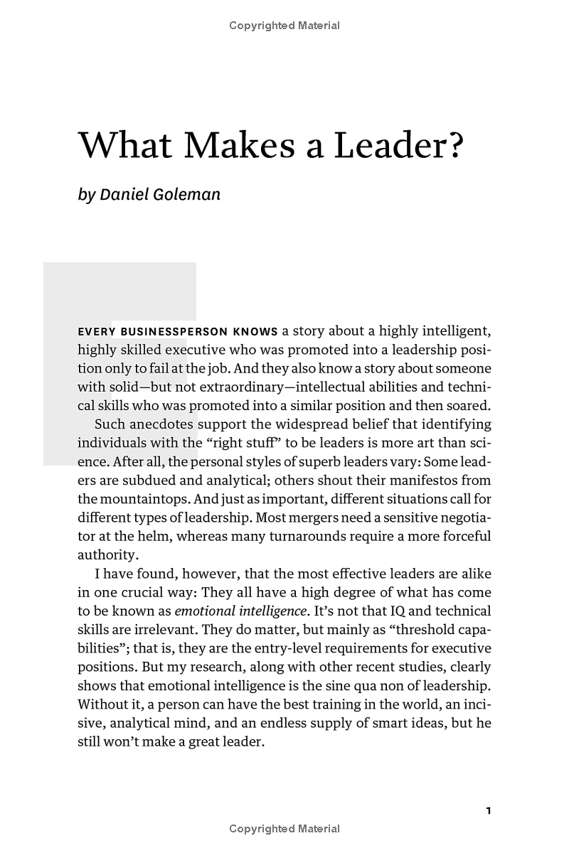 In his defining work on emotional intelligence, bestselling author Daniel Goleman found that it is twice as important as other competencies in determining outstanding leadership. If you read nothing else on emotional intelligence, read these 10 articles by experts in the field. We've combed through hundreds of articles in the Harvard Business Review archive and selected the most important ones to help you boost your emotional skills - and your professional success.