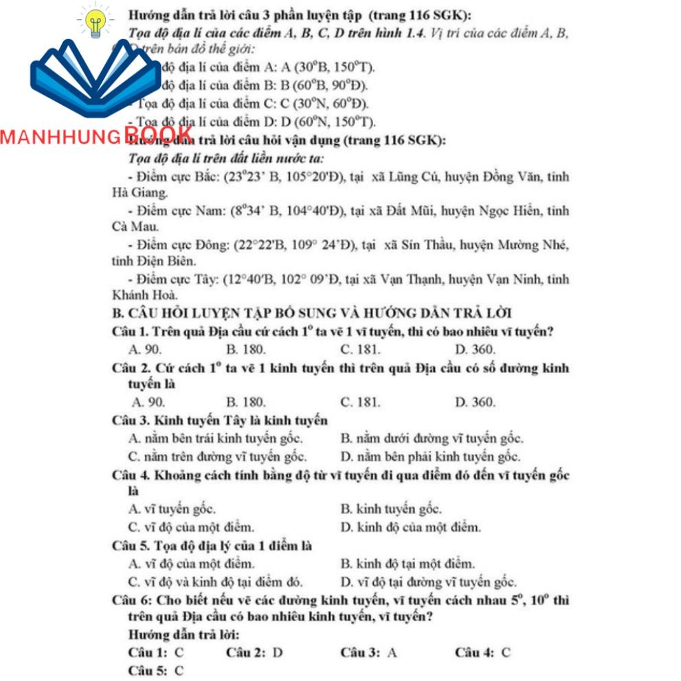 Trong cuốn sách này, các em được hướng dẫn trả lời các câu hỏi và bài tập trong các bài học, các câu hỏi và bài tập ở phần luyện tập và vận dụng của cuốn sách Lịch Sử và Địa Lí 6 ( Phần Địa Lí) bộ sách kết nối tri thức với cuộc sống. Bên cạnh đó, để giúp các em nâng cao kiến thức, rèn luyện kĩ năng tự kiểm tra, đánh giá, sau mỗi bài người biên soạn sách đưa thêm vào các câu hỏi luyện tập bổ sung và kèm theo phần hướng dẫn trả lời cụ thể để các em có thể đối chiếu với phần bài làm của mình