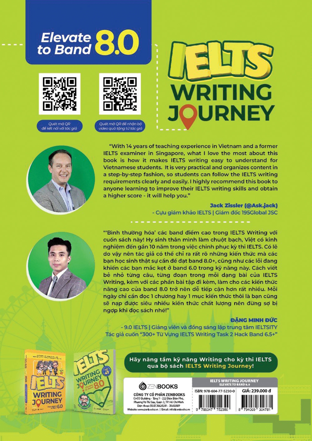 1. Ielts writing journey: elevate to band 8.0   Tác giả: Bùi Thành Việt Nhà phát hành: Zenbooks Nhà xuất bản: NXB Thế Giới Năm xuất bản: 2024 Mã sản phẩm: 8794069304781 Số trang: 268