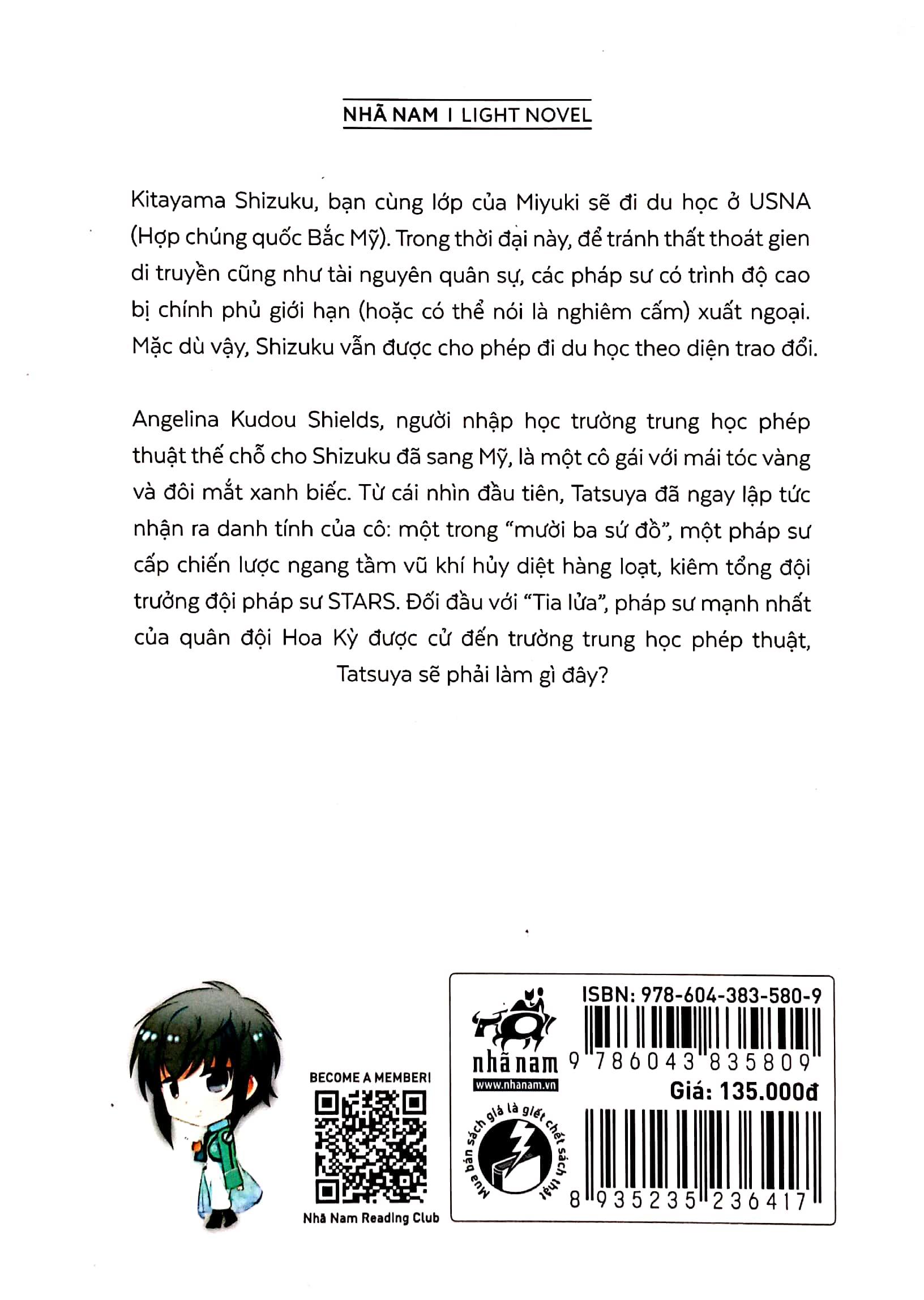 Kitayama Shizuku, bạn cùng lớp của Miyuki sẽ đi du học ở USNA (Hợp chúng quốc Bắc Mỹ). Trong thời đại này, để tránh thất thoát gien di truyền cũng như tài nguyên quân sự, các pháp sư có trình độ cao bị chính phủ giới hạn (hoặc có thể nói là nghiêm cấm) xuất ngoại. Mặc dù vậy, Shizuku vẫn được cho phép đi du học theo diện trao đổi. Angelina Kudou Shields, người nhập học trường trung học phép thuật thể chỗ cho Shizuku đã sang Mỹ, là một cô gái với mái tóc vàng và đôi mắt xanh biếc. Từ cái nhìn đầu tiên, Tatsuya đã ngay lập tức nhận ra danh tính của cô một trong “mười ba sứ đồ”, một pháp sư cấp chiến lược ngang tầm v.ũ khí hủy diệt hàng loạt, kiêm tổng đội trưởng đội pháp sư STARS. Đối đầu với “Tia lửa”, pháp sư mạnh nhất của quân đội Hoa Kỳ được cử đến trường trung học phép thuật, Tatsuya sẽ phải làm gì đây? VỀ TÁC GIẢ Sato Tsutomu Sato Tsutomu sinh năm 19XX tại một miền quê hẻo lánh của Nhật Bản. Anh từng xem thể loại khoa học viễn tưởng về vũ trụ là lương thực để sống qua thời niên thiếu. Thời thanh niên Sato Tsutomu chuyển sang đam mê thể loại giả tưởng và tiểu thuyết truyền kỳ. Sau khi tốt nghiệp, anh bán linh hồn cho thế giới hiện thực trong vai trò một chiến binh công sở (dù chỉ là lính lác). Năm 2011, anh trở lại thế giới giả tưởng trên cương vị một nhà văn cho tuổi teen ra mắt muộn màng. Minh họa: Ishida Kana Ishida Kana sinh năm 19XX. Đây là lần đầu cô làm công việc vẽ minh họa. Công việc chính của cô là họa sĩ phim hoạt hình. Những tác phẩm điển hình trước đây của Ishida Kana là CODE GEASS: Lelouch of the Rebellion, Mobile Suit Gundam Unicorn (giám sát hình ảnh), Ore no Imoto ga Konnani Kawaii Wake ga Nai (đạo diễn hình ảnh)…
