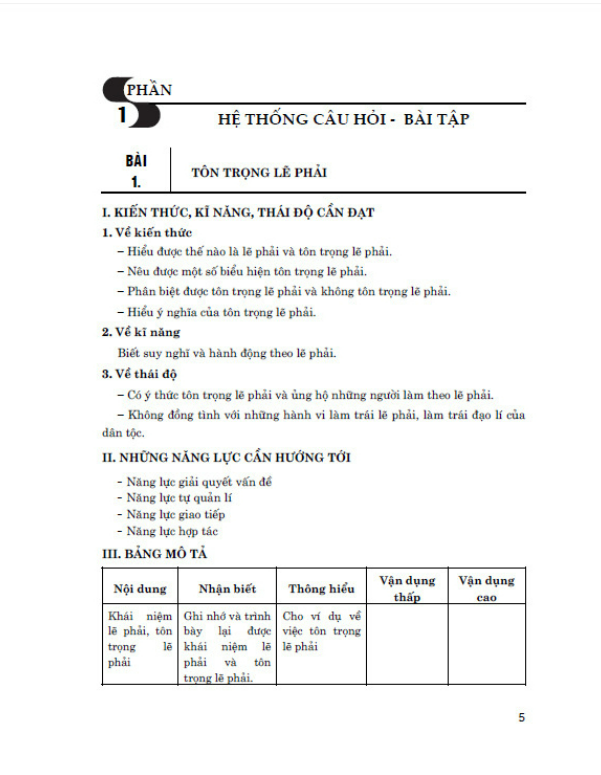 Các đề kiểm tra 1 tiết và học kỳ có cấu trúc thống nhất: I. Mục tiêu kiểm tra, II. Hình thức kiểm tra, III. Ma trận đề kiểm tra, IV. Đề kiểm tra, V. Đáp án, thang điểm và hướng dẫn chấm. Do đặc thù của môn Giáo dục công dân, các câu hỏi trong đề kiểm tra không chỉ kiểm tra kiến thức mà quan trọng là kiểm tra các kĩ năng, thái độ, tình cảm của học sinh đối với các hiện tượng, vấn đề đạo đức và pháp luật trong cuộc sống