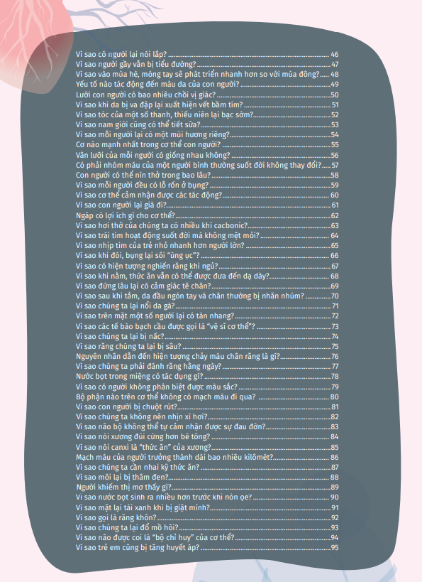 Tuổi thơ là khoảng thời gian đẹp nhất trong cuộc đời mỗi con người. Ở lứa tuổi này, trẻ luôn tràn trề hy vọng, cùng những ngây thơ trong sáng buổi ban đầu. Đứng trước thế giới với bao điều kỳ diệu mang trong mình sự tò mò, khát vọng tìm hiểu, câu nói thường thấy nhất ở trẻ là "Vì sao?" Để có thể trả lời chính xác câu hỏi của trẻ, không phải là việc đơn giản. Các nghiên cứu cho thấy, sự phát triển ở bộ não trẻ diễn ra nhanh nhất trong 13 năm đầu đời. Là một phụ huynh, khi không mang lại cho trẻ cơ hội suy nghĩ, tìm hiểu, có thể bạn sẽ phải hối tiếc! Thế giới ngày nay phát triển nhanh chóng, kho tàng kiến thức là vô hạn, luôn được đổi mới với tốc độ chóng mặt. Cũng xuất phát từ những suy nghĩ trên, chúng tôi đã thu thập rộng rãi, lựa chọn kĩ càng các câu hỏi mà các em nhỏ cảm thấy hứng thú để đưa ra bộ sách Mười vạn câu hỏi vì sao?, mang lại cho các em những câu trả lời theo từng chủ đề. Cuốn sách, với sự đóng góp của các chuyên gia khoa học thường thức giàu kinh nghiệm, sử dụng ngôn ngữ dễ hiểu, kết hợp những hình ảnh minh họa sinh động sẽ mang đến cho các em những kiến thức cơ bản, chứa đựng nội dung phong phú, xoay quanh nhiều chủ đề hấp dẫn: