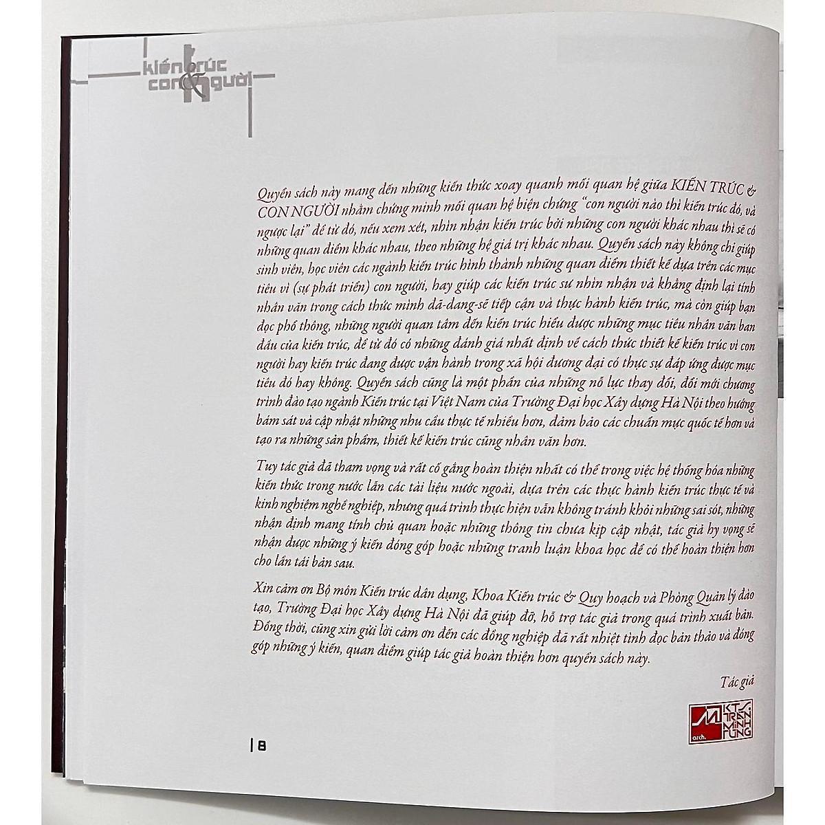 Con người chạy không nhanh, bơi không giỏi, bay không biết, lại không có răng nanh và móng vuốt, không có cơ thể to lớn và cơ bắp khỏe, không có bộ lông điều hòa nhiệt... Vì vậy, kiến trúc như một “tiểu môi trường” quan trọng làm chỗ nương tựa của con người. Từ đó, kiến trúc phát triển là do con người, của con người và vì con người. Nhưng rồi con người đã quá tự hào về những sáng tạo của mình, theo đuổi những tham vọng “cao cả” hơn rất nhiều nên đôi lúc kiến trúc lại rời xa mất những xuất phát điểm, những mục tiêu ban đầu do chính con người đặt ra. May mắn thay, gần đây, các xu hướng thực hành kiến trúc và những người hành nghề kiến trúc đã xác định lại sứ mệnh xã hội, quay trở lại với nguồn gốc con người của kiến trúc.