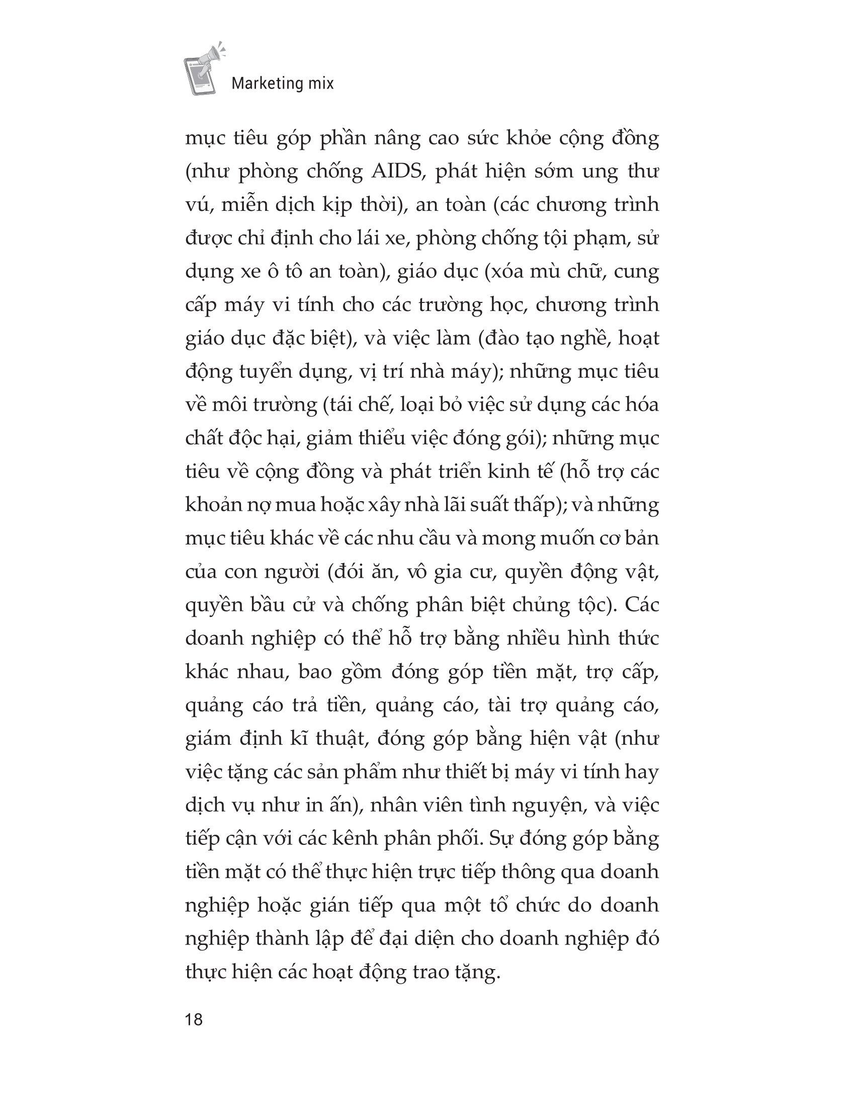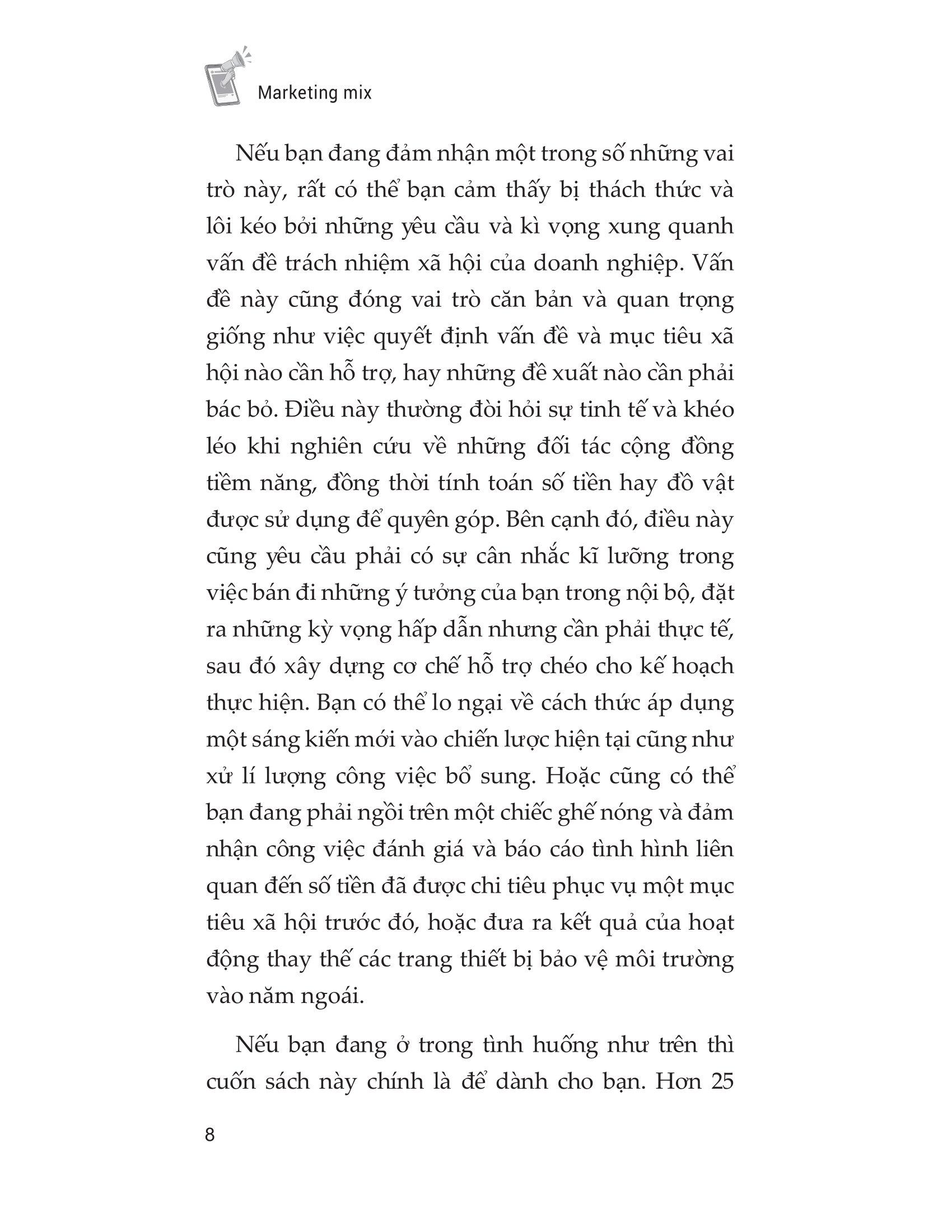 Cuốn sách Marketing mix sẽ giúp các nhà quản lí doanh nghiệp và các nhân viên có được sự chuẩn bị tốt hơn trong việc lựa chọn những vấn đề phù hợp nhất, những đối tác tốt nhất, và những chiến lược marketing hiệu quả nhất, giúp tối đa hóa lợi nhuận của doanh nghiệp đồng thời thực hiện tốt nhất các vấn đề về môi trường, kinh tế và xã hội. Môi trường kinh doanh ngày càng có nhiều biến động và khác biệt, chính vì vậy, các doanh nghiệp luôn cần trong trạng thái sẵn sàng đối mặt cũng như có chiến lược dự phòng để thích ứng kịp thời. Bằng cách áp dụng các mô hình này, doanh nghiệp có thể hiểu rõ về thị trường, khách hàng mục tiêu cũng như đối thủ cạnh tranh để từ đó có thể đưa ra những chiến lược, cũng như các quyết định quan trọng. Với cuốn sách này, bạn sẽ học hỏi được những bài học sâu sắc và đó chính là chìa khóa giúp bạn đạt được thành công.