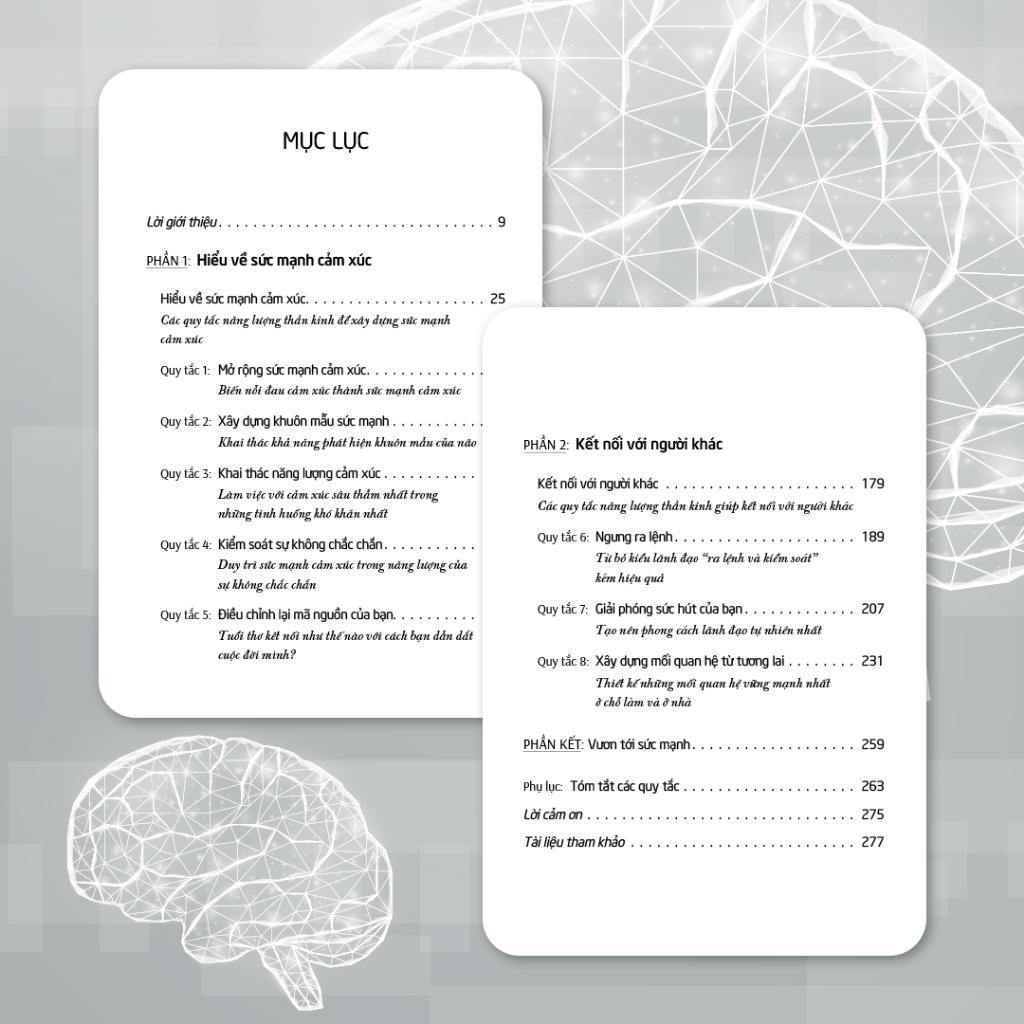 Cuốn sách bao gồm 8 quy tắc, được thiết kế như một giúp bạn khai thác tiềm năng của bộ não và tạo ra những thay đổi sâu sắc trong cuộc sống của chính mình lẫn những người xung quanh. Điều làm Năng lượng cảm xúc trở nên khác biệt chính là: những phương pháp “lạ lùng” và khác thường nhưng lại vô cùng hiệu quả, những câu hỏi xoáy sâu để ta tự khám phá tường tận những ngóc ngách của cảm xúc và cả những phân tích vừa khoa học vừa nhân văn khiến ta không ngừng gật gù cảm thán.