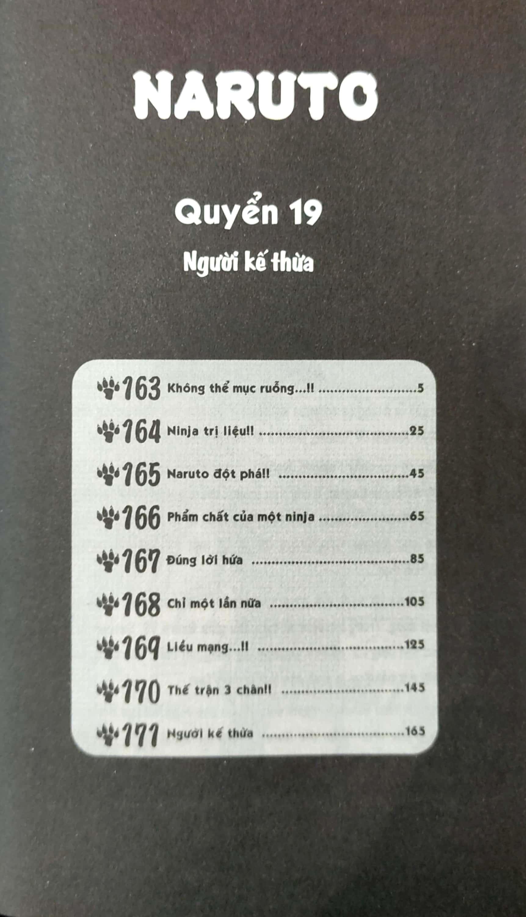 Naruto - Tập 19 - Người Kế Thừa “Quả nhiên chỉ có hồi ức này là không thể mục rữa...”. Sự hiện diện của Naruto đã xóa bỏ hết những lầm lạc của Tsunade. Đòn tấn công giữa Tsunade, Orochimaru và Kabuto đã dẫn lối Jiraiya, Naruto và Shizune tìm đến, báo hiệu cho một trận đấu độc nhất vô nhị!! MASASHI KISHIMOTO “Nhoằng một cái tôi đã vẽ NARUTO được 4 năm. Tôi đã luôn nỗ lực cố gắng đến tận bây giờ... và cũng có chút chìm đắm trong thế giới này. Tôi cũng sẽ tiếp cố gắng cho năm thứ 5 sắp tới!”