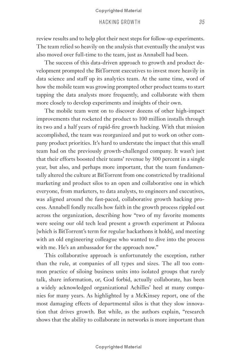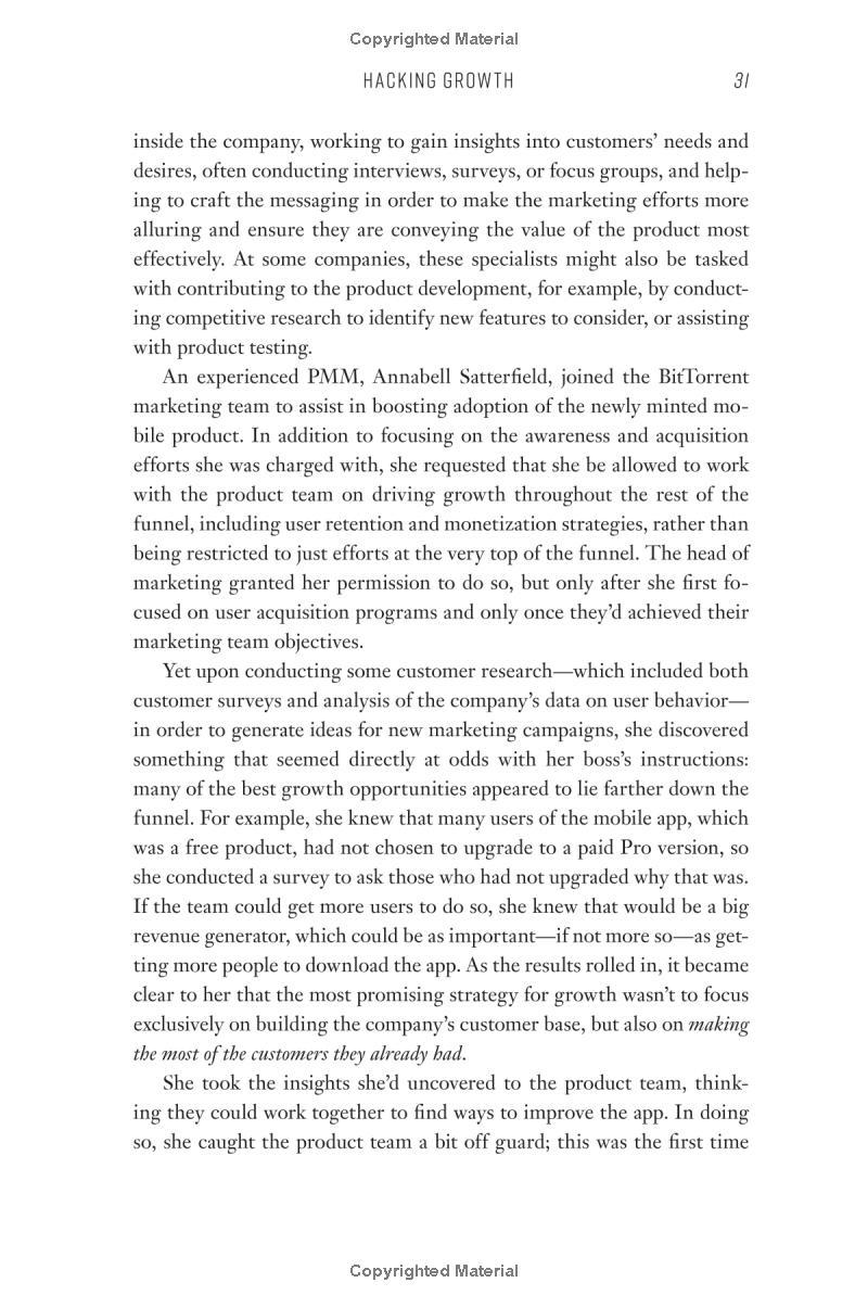 hacking growth is a highly accessible, practical, method for growth that involves cross-functional teams and continuous testing and iteration. hacking growth does for marketshare growth what the lean startup does for product development and business model generation does for strategy. hacking growth focuses on customers - how to attain them, retain them, engage them, and monetize them - rather than product.