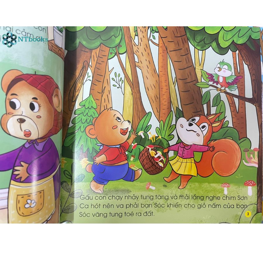 Bộ Sách Bồi Dưỡng Nhân Cách Và Tâm Hồn Trẻ - Sóc Con Hiếu Thảo (Dành Cho Trẻ Từ 0-3 Tuổi) Trẻ từ 0-3 tuổi là thời kì phát triển mạnh mẽ về trí tuệ, thể chất và kĩ năng. Vì vậy, giáo dục kĩ năng sống cho trẻ từ 0 - 3 tuổi là việc vô cùng cần thiết, giúp trẻ có nhận thức, hành động và tình cảm đúng mực. Khi trẻ biết cách xử lý các tình huống trong cuộc sống một cách nhanh nhạy, có thể vượt qua những khó khăn nhỏ đầu đời thì bản thân chúng sẽ hình thành nên tính cách mạnh mẽ và sự tự tin cần thiết sau này. Bộ sách Bồi dưỡng nhân cách và tâm hồn trẻ (Dành cho trẻ từ 0-3 tuổi) gồm 5 cuốn, là những câu chuyện nhẹ nhàng, dung dị, đời thường. Từ những câu chuyện nhỏ với các nhân vật là loài vật dễ thương, hình ảnh minh họa đẹp mắt, bộ sách như một món quà ý nghĩa mà cha mẹ dành tặng con. Mỗi lần cùng con đọc sách là mỗi lần cha mẹ trao gửi thông điệp và kết nối yêu thương đến con. Trẻ sẽ có cơ hội học quan sát, so sánh, phát huy trí tưởng tượng qua các tình huống thú vị trong sách. Bài học giá trị về các kĩ năng cần thiết cũng sẽ tự nhiên ngấm dần vào tâm hồn trong sáng, hồn nhiên của trẻ: Kĩ năng tự lập; kĩ năng giao tiếp ứng xử; kĩ năng hoàn thành nhiệm vụ học tập ở trường, không tự ý bỏ học đi chơi để tránh gặp nguy hiểm; kĩ năng kiềm chế cảm xúc, biết nhường nhịn và yêu thương những người thân trong gia đình… Mỗi câu chuyện nhỏ nằm trong bộ sách đều mang ý nghĩa giáo dục vô cùng sâu sắc, giúp trẻ bồi dưỡng tâm hồn và hoàn thiện bản thân. Học được càng nhiều kĩ năng, trẻ sẽ càng trưởng thành, là con ngoan, trò giỏi, được cha mẹ, thầy cô và bạn bè tin tưởng, yêu mến. Ở lớp, Sóc Con là một học sinh ngoan, được bạn bè yêu quý, còn ở nhà Sóc Con là người con hiếu thảo, hiểu chuyện. Cô bé biết giúp mẹ làm việc nhà, hơn nữa, biết chăm sóc bà khi bà bị ốm. Những việc làm của Sóc Con tuy nhỏ nhưng rất đáng khen…
