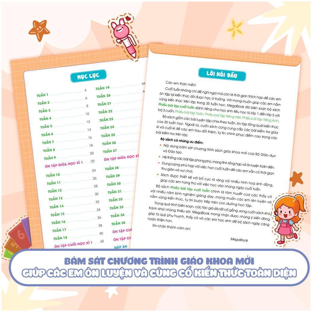 Cuối tuần không chỉ để nghỉ ngơi mà còn là thời gian thích hợp để các con ôn tập lại kiến thức đã được học ở trường. Với mong muốn giúp các con nắm vững kiến thức trên lớp trong 35 tuần học, MegaBook đã biên soạn bộ sách Phiếu bài tập cuối tuần dành riêng cho học sinh tiểu học từ lớp 1 đến lớp 5 với bộ 3 cuốn: Phiếu bài tập Toán, Phiếu bài tập Tiếng Việt, Phiếu bài tập Tiếng Anh. Bộ sách gồm các bài luyện tập chia theo tuần, ôn tập tổng quát kiến thức của 35 tuần học. Ngoài ra, cuốn sách cũng cung cấp các bài kiểm tra giữa kỳ và cuối kỳ để các con trau dồi thêm, tự tin chinh phục điểm cao trong các bài kiểm tra trên lớp. ƯU ĐIỂM CỦA CUỐN SÁCH PHIẾU BÀI TẬP CUỐI TUẦN TIẾNG VIỆT 4: