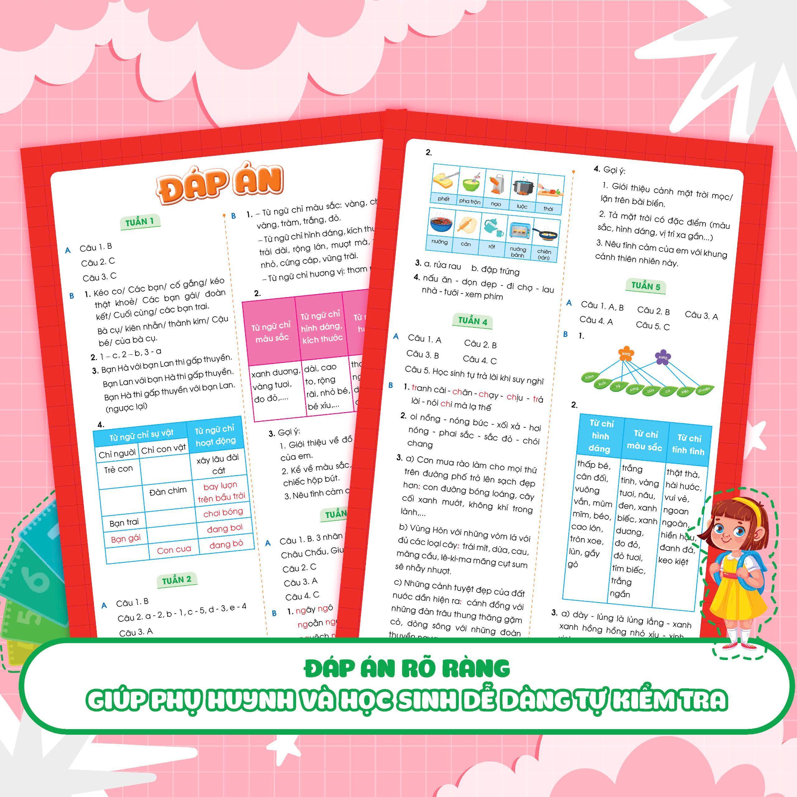 Đặc biệt, sau mỗi kì sẽ có bài ôn tập giữa kì và cuối kì giúp con có tài liệu ôn tập cho các kì kiểm tra. Ngoài ra, phần đáp án phía sau giúp bố mẹ đánh giá năng lực, từ đó có phương pháp ôn luyện phù hợp cho con.