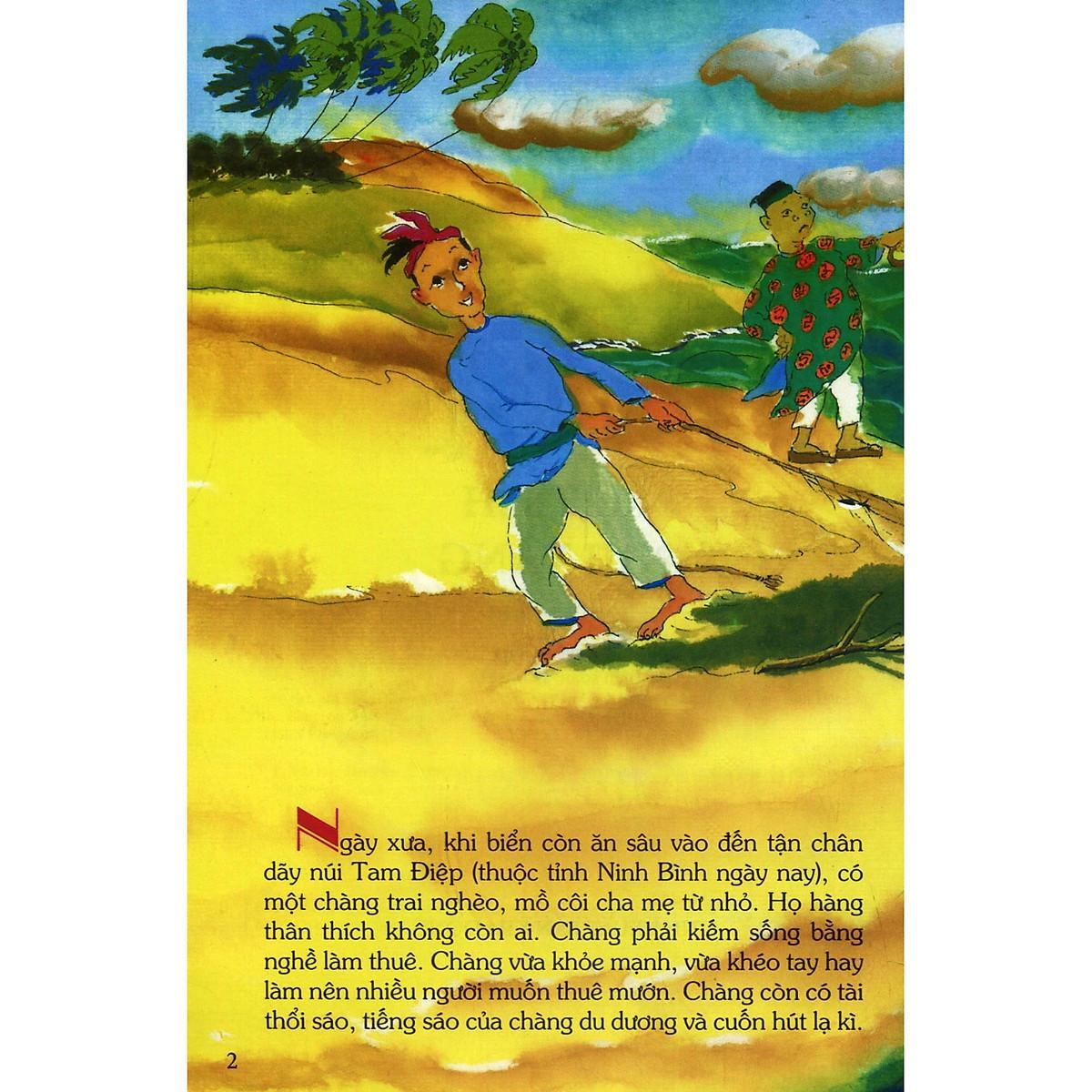 Giới thiệu sách Những câu chuyện dân gian giúp các em giàu thêm mơ ước, biết sống đẹp và trân trọng truyền thống cha ông. Cùng tìm đọc hơn 100 cuốn Tranh truyện dân gian Việt Nam do NXB Kim Đồng ấn hành! Tóm tắt nội dung Chàng mồ côi nhờ tiếng sáo du dương của mình đã khiến nàng tiên út nhà Trời cảm mến. Thế rồi họ nên duyên chồng vợ. Nhưng mối duyên giữa kẻ trần người tiên gặp nhiều trắc trở gian nan. Các em cùng đọc câu chuyện cảm động về tình cảm gia đình, đồng thời biết thêm về sự tích núi Vàng ở đất Tam Điệp - Ninh Bình ngày nay.