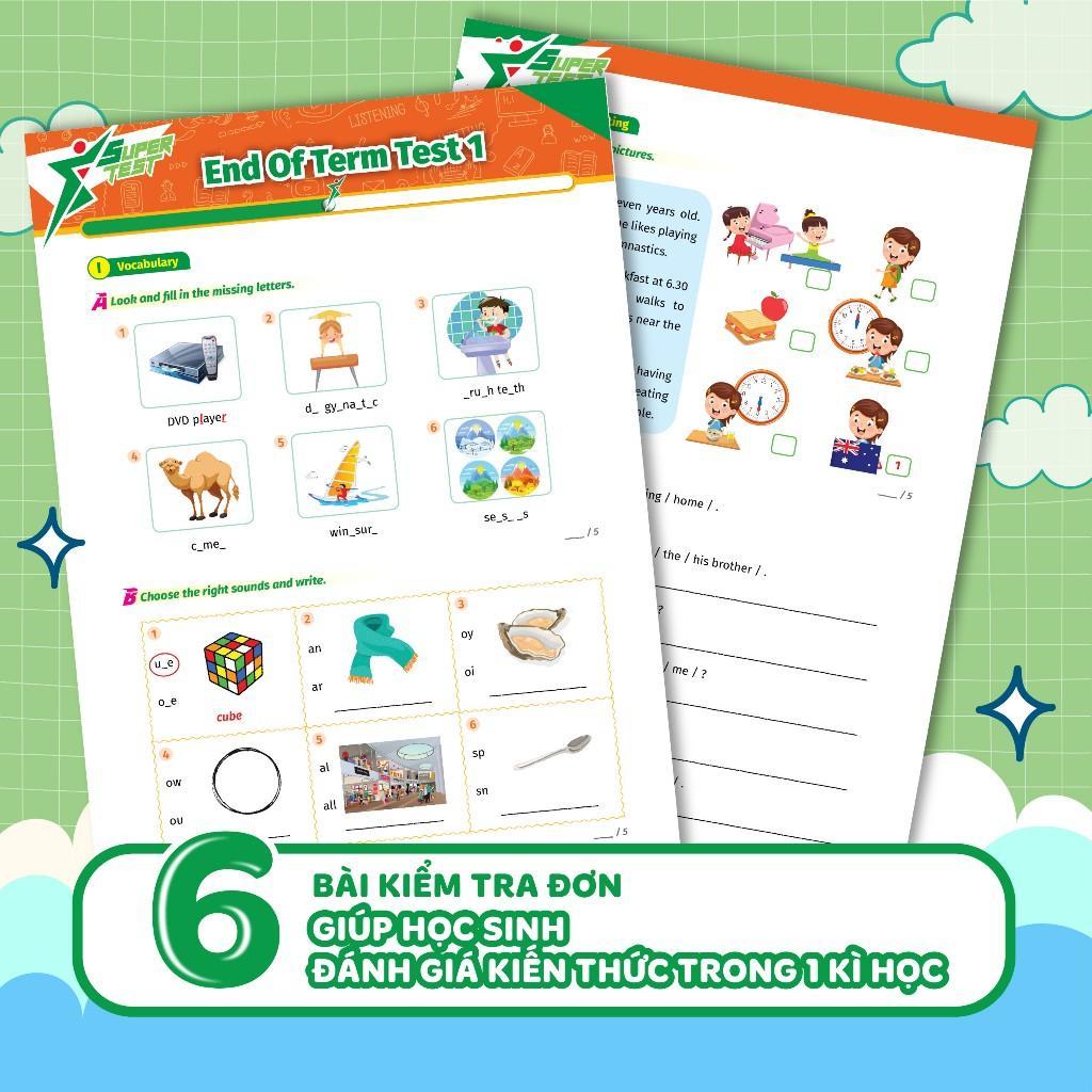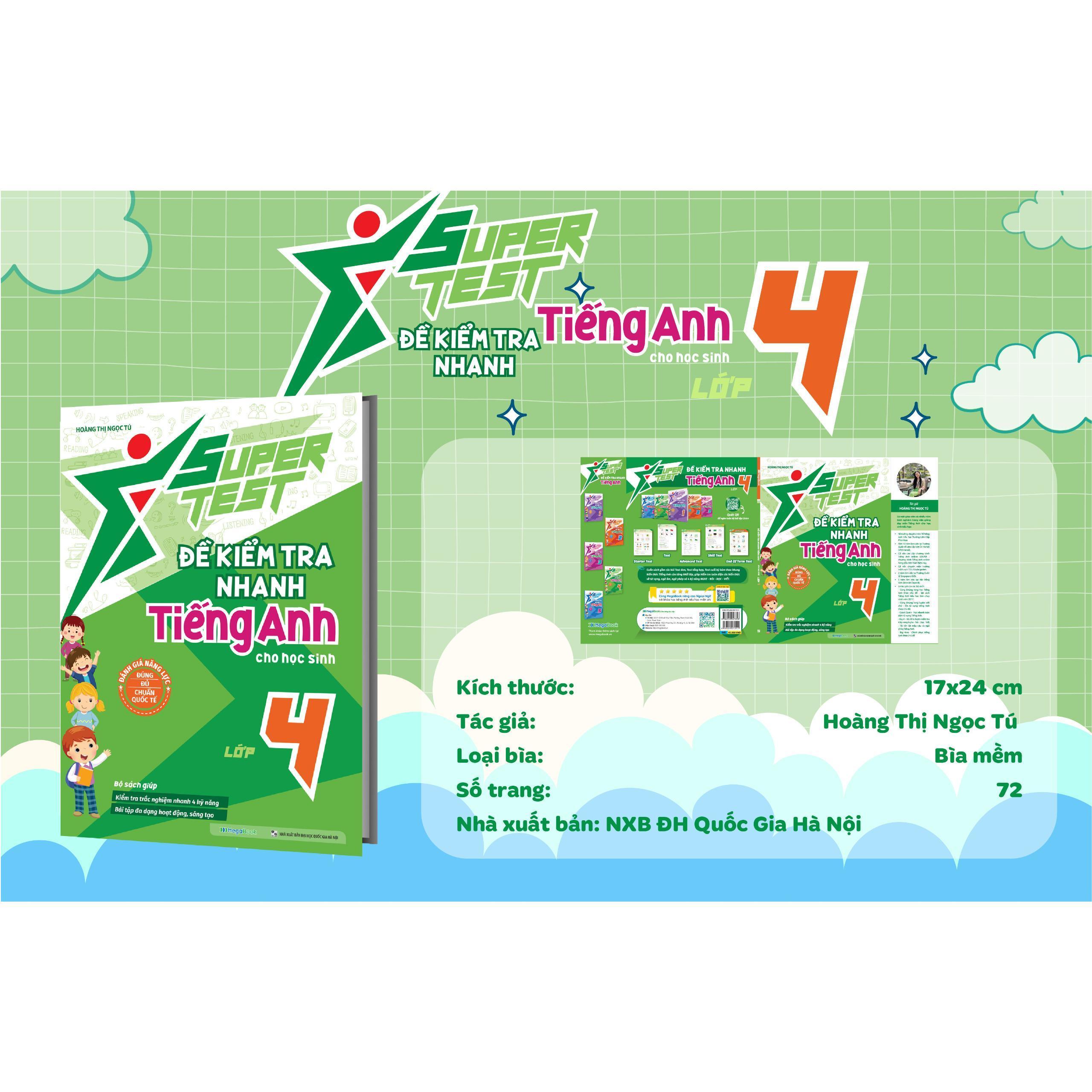 Với Bộ sách Super Test – Đề kiểm tra nhanh Tiếng Anh cho học sinh, bố mẹ sẽ giúp con tiến bộ từng ngày, tự tin với khả năng ngôn ngữ của mình khi ôn luyện Tiếng Anh bởi các bài tập về 4 kỹ năng: Nghe – Nói – Đọc – Viết được liên kết với nhau theo logic của bài học.