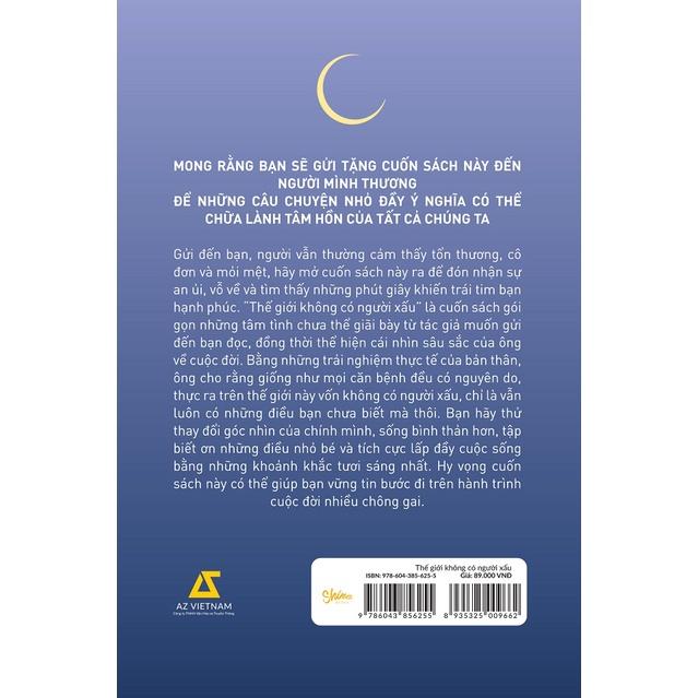 Gửi đến bạn, người vẫn thường cảm thấy tổn thương, cô đơn và mỏi mệt, hãy mở cuốn sách này ra để đón nhận sự an ủi, vỗ về và tìm thấy những phút giây khiến trái tim bạn hạnh phúc. “Thế giới không có người xấu” là cuốn sách gói gọn những tâm tình chưa thể giãi bày từ tác giả muốn gửi đến bạn đọc, đồng thời thể hiện cái nhìn sâu sắc của ông về cuộc đời. Bằng những trải nghiệm thực tế của bản thân, ông cho rằng giống như mọi căn bệnh đều có nguyên do, thực ra trên thế giới này vốn không có người xấu, chỉ là vẫn luôn có những điều bạn chưa biết mà thôi. Bạn hãy thử thay đổi góc nhìn của chính mình, sống bình thản hơn, tập biết ơn những điều nhỏ bé và tích cực lấp đầy cuộc sống bằng những khoảnh khắc tươi sáng nhất. Hy vọng cuốn sách này có thể giúp bạn vững tin bước đi trên hành trình cuộc đời nhiều chông gai.
