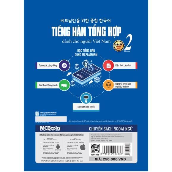 Tiếng Hàn Tổng Hợp Dành Cho Người Việt Nam - Sơ Cấp 1 Trong những năm gần đây, nhu cầu học tiếng Hàn và tìm hiểu về văn hóa Hàn Quốc đang có xu hướng tăng lên. Người học tiếng Hàn rất mong muốn có được một bộ giáo trình chuẩn, được biên soạn một cách tỉ mỉ và hữu ích nhất. Giáo trình tiếng Hàn tổng hợp lần đầu tiên được trao bản quyền chính thức tại Việt Nam Hiểu được điều đó, ngày 4-7, Đại diện chính phủ Hàn Quốc, ngài Woo Hyeong Min – Trưởng đại diện Văn phòng Quỹ giao lưu Quốc tế HQ tại Việt Nam cùng GS.TS.NGƯT Mai Ngọc Chừ – Chủ tịch Hội Nghiên cứu khoa học về Hàn Quốc của Việt Nam (KRAV) đã trao quyết định cho phép Công ty Cổ phần sách MCBooks của Việt Nam được xuất bản cuốn sách này tại thị trường Việt Nam. Và đây chính là bộ giáo trình tiếng Hàn tổng hợp đầu tiên có bản quyền chính thức có mặt tại Việt Nam. Cũng theo ông Woo Hyeong Min, Thực tế đây là bộ giáo trình chính thống mà tất cả người học tiếng Hàn tại Việt Nam cần sử dụng. Tuy nhiên nhiều năm qua bộ sách đến tay người dùng đều là sách lậu nên chưa đạt được kết quả mà chính phủ Hàn muốn mang tới Việt Nam. Do đó Chính phủ Hàn Quốc đã quyết định tìm 1 đơn vị xuất bản uy tín của Việt Nam để giúp họ mang đến cho người học những cuốn sách tiếng Hàn chất lượng tốt với giá cả hợp lý. Bộ giáo trình được Hội nghiên cứu khoa học Hàn Quốc của Việt Nam biên soạn và hiệu đính. Bộ giáo trình sẽ giúp nâng cao hiệu quả trong việc sử dụng ngôn ngữ Hàn sau tiếng mẹ đẻ và tiếng Anh, là nền tảng giúp người lao động Việt Nam nhận được những vị trí làm việc cao trong doanh nghiệp Hàn Quốc. Đây cũng là cách để thúc đẩy quan hệ hợp tác về văn hoá và giáo dục giữa hai nước trong thời gian tới. Giới thiệu cuốn Giáo trình tiếng Hàn tổng hợp dành cho người Việt Nam – Sơ cấp 1 Giáo trình tiếng Hàn tổng hợp dành cho người Việt Nam – Sơ cấp 1 được biên soạn dành cho người Việt Nam muốn học tiếng Hàn ở trình độ sơ cấp. Sách được biên soạn nhằm hướng tới việc sử dụng được trong các tiết học tiếng Hàn tại giảng đường đại học nên mỗi bài học được chia thành nhiều phần như: Lý thuyết cơ bản gồm từ vựng và cấu trúc ngữ pháp; phần luyện tập theo 4 kỹ năng giao tiếp như: Nghe – Nói – Đọc – Viết, phần luyện phát âm, phần tìm hiểu văn hóa… Các chủ đề trong sách được sắp xếp một cách có hệ thống và liên quan chặt chẽ với nhau. Giáo trình tiếng Hàn tổng hợp được biên soạn kèm theo một cuốn sách bài tập hỗ trợ giúp người học ôn tập kỹ hơn và có thể luyện tập nâng cao trong những trường hợp cần thiết. Nội dung trong Giáo trình tiếng Hàn tổng hợp – Sơ cấp 1 2 cuốn sách trong bộ Sơ cấp được xây dựng với 30 bài khóa và bảng chữ cái. Trong đó quyển 1 gồm phần bảng chữ cái và 15 bài đầu. Học hết quyển 1, bạn sẽ học đến quyển sơ cấp 2 với 15 bài còn lại. Cấu trúc tổng thể của giáo trình được xây dựng theo các chủ đề; mỗi chủ đề được liên kết thống nhất với một hệ thống các từ vựng và cấu trúc ngữ pháp cơ bản, bài tập ứng dụng, kỹ năng và tìm hiểu văn hóa. Trong mỗi bài học, nội dung học được chia thành các phần như: luyện từ vựng, luyện ngữ pháp cơ bản, luyện tập kỹ năng nghe – nói – đọc – viết, luyện phát âm, tìm hiểu văn hóa của đất nước Hàn Quốc xinh đẹp. Và kết thúc mỗi bài đều có thêm bảng từ mới xuất hiện trong bài học. Phần cuối của sách, các tác giả đưa ra hệ thống từ mới được sắp xếp theo thứ tự của bảng chữ cái. Đây là những từ không xuất hiện trong phần ngữ pháp, từ vựng cơ bản; nhưng lại xuất hiện nhiều ở phần luyện tập của từng bài.