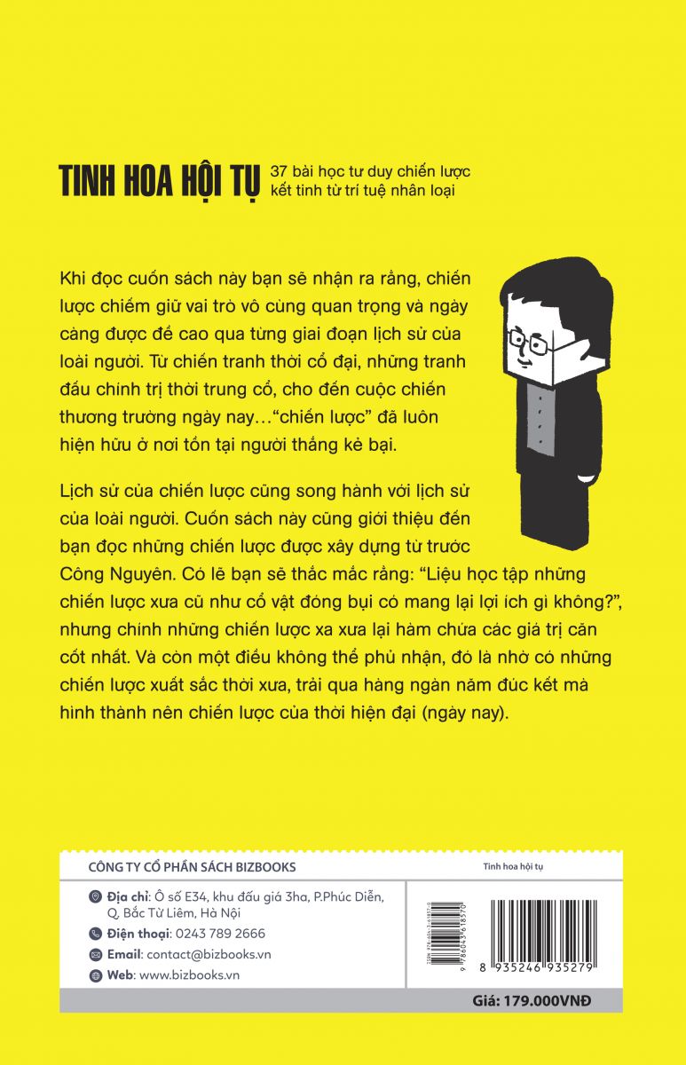 - Tặng voucher giảm giá 5% khi mua sách tại Bizbooks lần tiếp theo. Lưu ý: Chỉ có sách chính hãng của Bizbooks mới có thể quét mã QR-code để nhận các bản Audiobooks - Sách nói đi kèm. Nội dung cuốn Tinh hoa hội tụ - 37 bài học tư duy chiến lược kết tinh từ trí tuệ nhân loại “Tinh hoa hội tụ - 37 bài học tư duy chiến lược kết tinh từ trí tuệ nhân loại” sẽ giới thiệu “khái quát” từ những chiến lược mới nhất đã và đang tác động to lớn đến giới kinh doanh, cho đến tri thức thâm thúy của các chiến lược cổ xưa được kế thừa hàng ngàn năm thông qua 7 chương: Chương 1: Chiến lược chiến tranh thời kì Cổ - Trung - Hiện đại Chương 2: Chiến lược cạnh tranh Chương 3: Chiến lược cạnh tranh tránh cạnh tranh Chương 4: Chiến lược cơ cấu doanh nghiệp Chương 5: Chiến lược thực thi Chương 6: Chiến lược đổi mới Chương 7: Chiến lược thời đại IT Chương 8: Lịch sử chiến tranh Bằng lối hành văn cuốn hút, kết hợp hình ảnh minh họa sinh động, cuốn sách chứa đầy những kiến thức bổ ích về chiến lược phù hợp với các bạn sinh viên đang trong giai đoạn tìm việc, cho đến những doanh nhân muốn có thêm ý tưởng cho kế hoạch kinh doanh mới, hay những ai muốn tìm kiếm tri thức để thiết kế cho bản thân một cuộc đời sống không hối tiếc. Khi đọc cuốn sách này, bạn sẽ nhận ra rằng, chiến lược giữ vai trò vô cùng quan trọng và ngày càng được đề cao qua từng giai đoạn lịch sử loài người. “Chiến lược” đã luôn hiện hữu ở nơi tồn tại người thắng kẻ bại. Lĩnh hội những tri thức cổ đại nhất định sẽ giúp bạn thấu hiểu sâu sắc hơn khi tiếp thu chiến lược mới nhất hiện nay. “Chiến lược = tiêu chí cần đạt được” là tầm nhìn thông suốt tương lai, nhờ đó ta sẽ học được thói quen “lên kế hoạch cho tương lai”. Vậy nên, khi bạn đối diện với hoàn cảnh khó khăn trong cuộc sống, “tư duy” chiến lược sẽ trở thành chiếc phao cứu cánh cho bạn. Bạn chắc chắn sẽ không còn quẩn quanh trong nỗi bất an vô định về tương lai mà có thể sống một cách “có chiến lược” theo đúng nghĩa đen của nó. Học về các bước tiến của chiến lược cũng là chiêm nghiệm về trí tuệ của loài người, lần theo những tinh hoa tri thức của con người. Lĩnh hội những tri thức cổ đại nhất định sẽ giúp bạn thấu hiểu sâu sắc hơn khi tiếp thu chiến lược mới nhất hiện nay. Những chiến lược là giá trị tinh hoa, di sản mà những thế hệ trước đã để lại cho chúng ta. Đó là điều có thể áp dụng được bất chấp thời gian và không gian. Đừng chần chừ, hãy cùng với Bizbooks bước vào một thế giới mới lạ của chiến lược - giáo trình ứng dụng thời hiện đại ngay hôm nay. Thông tin chi tiết cuốn sách Tinh hoa hội tụ - 37 bài học tư duy chiến lược kết tinh từ trí tuệ nhân loại