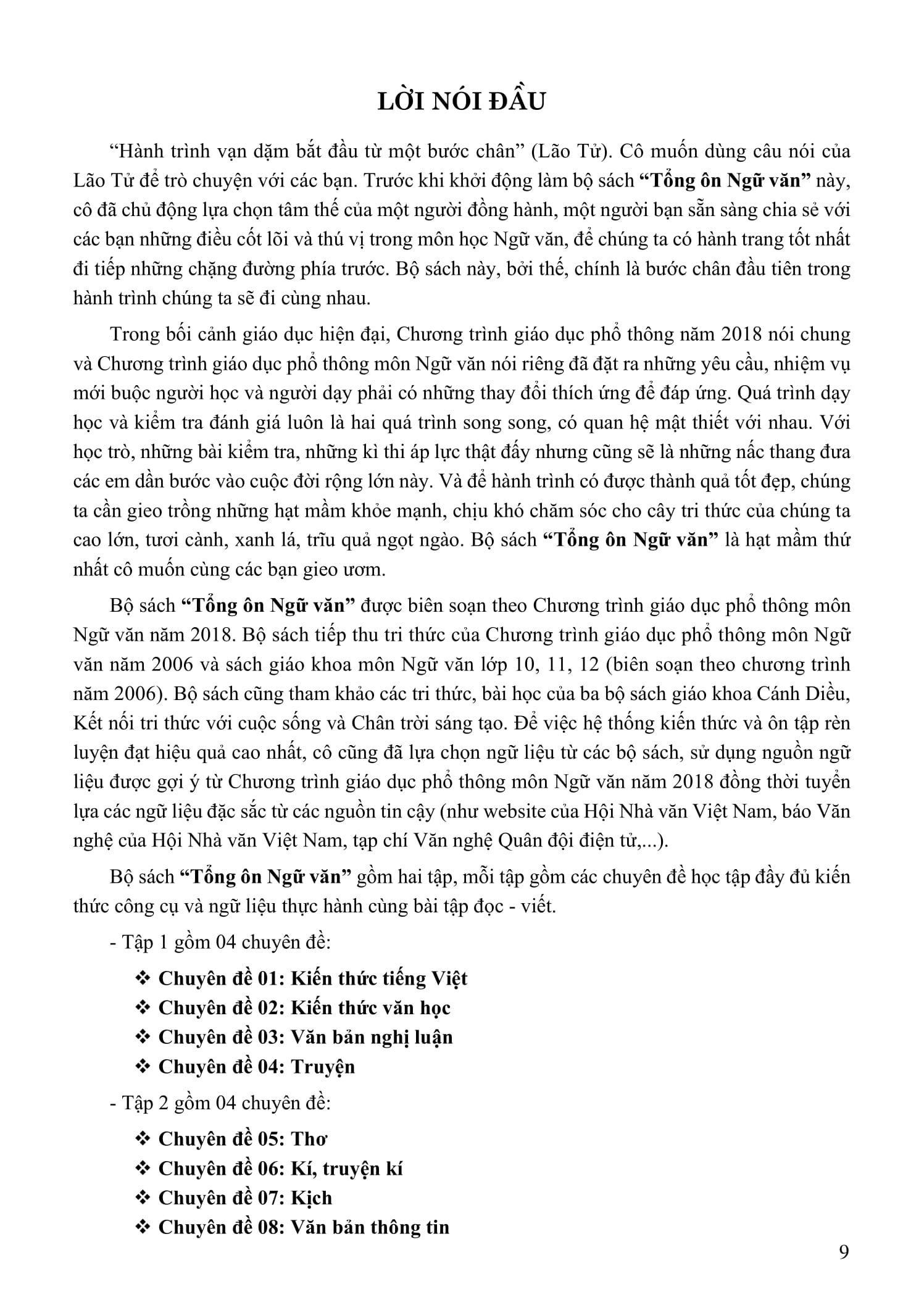 Bộ sách " Tổng ôn ngữ văn được biên soạn theo chương trình gáo dục phổ thông môn Ngữ văn năm 2018.Bộ sách tiếp thu tri thức của Chương trình giáo dục phổ thông môn Ngữ Văn năm 2006 và sách gáo khoa môn Ngữ văn lớp 10, 11, 12. Bộ sách cũng tham khảo các tri thức, bài học của ba bộ sách giáo khoa Cánh Diều, kết nối tri thức với cuộc sông và Chân trời sáng tạo. Để việc hệ thống kiến thức và ôn tập rèn luyện đạt hiệu quả cao nhất cô cũng đ.ã sử dụng ngữ liệu từ các bộ sách, tuyển lựa các ngữ liệu đặc sắc từ các nguồn tin cậy.