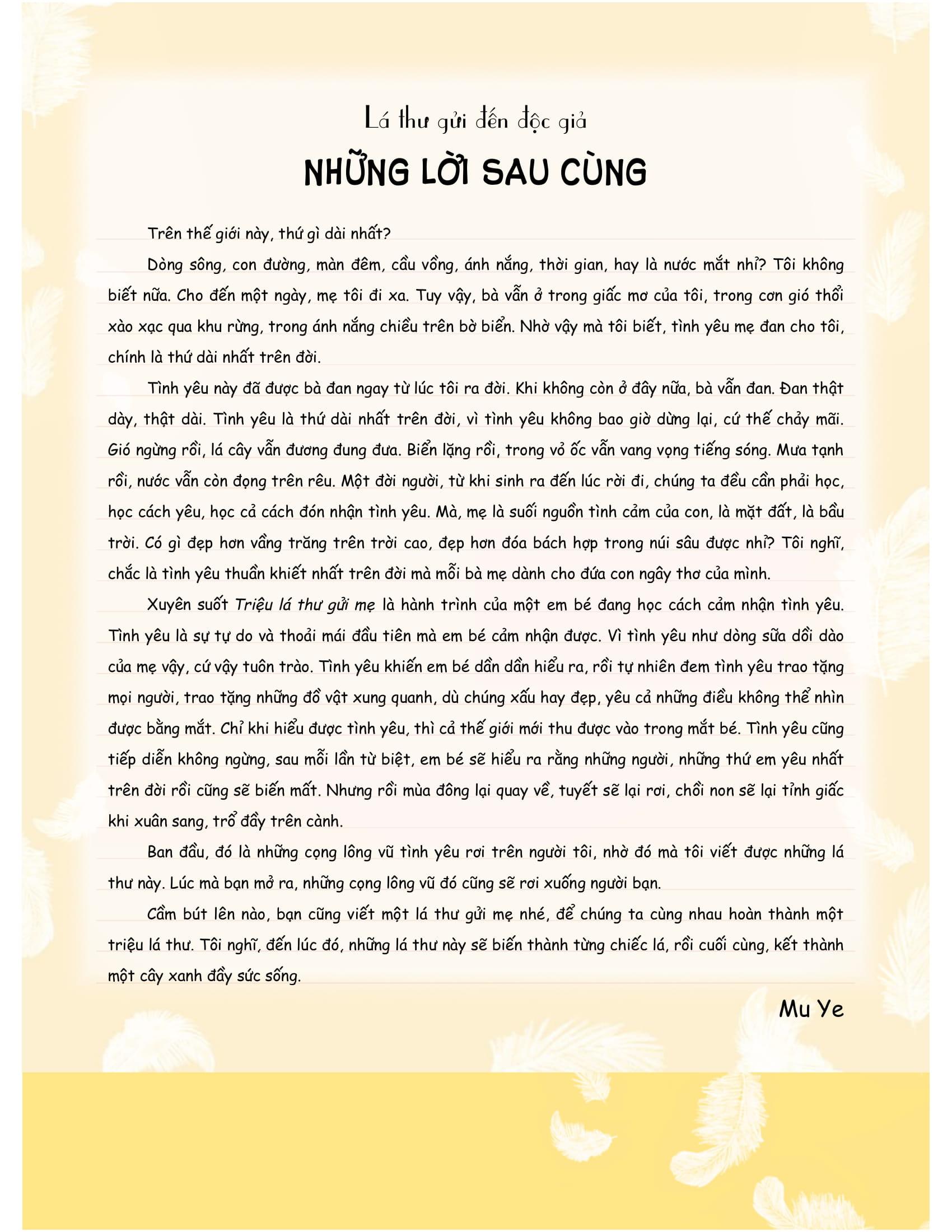 Triệu Lá Thư Gửi Mẹ "Triệu Lá Thư Gửi Mẹ" là một tác phẩm đầy cảm xúc của nhà văn Mu Ye. Đây không chỉ là một cuốn sách, mà còn là một lời tri ân, một món quà tinh thần mà tác giả dành tặng ...