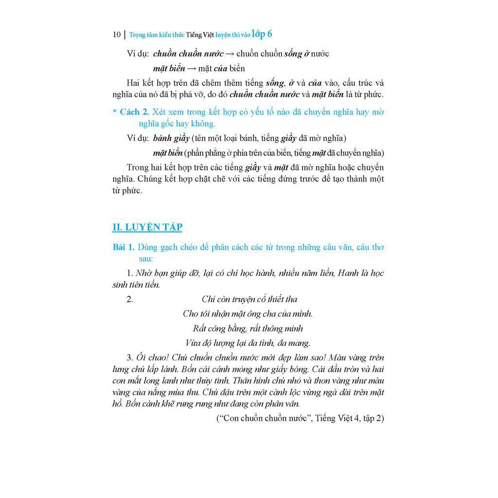 Hoàn thiện kiến thức môn tiếng Việt, rèn kỹ năng làm bài, làm quen với cấu trúc để thi, biết cách phân bổ thời gian hợp lý khi làm bài... luôn luôn là nỗi lo của học sinh và phụ huynh khi các em bước vào kỳ thi chuyển cấp. Với kinh nghiệm nhiều năm trong nghề, nguyên Tổ trưởng Tổ Xã hội Trường THCS và THPT Việt Úc , nguyên giáo viên THPT Chuyên Ngoại ngữ , có Nguyễn Thị Thủy Anh đã viết ra bộ sách "Trọng tâm kiến thức tiếng Việt luyện thi vào lớp 6" gồm 2 tập, sẽ là tài liệu cực kỳ hữu ích, giúp các em học sinh đạt điểm 9, 10 trong kỳ thi vào lớp 6.