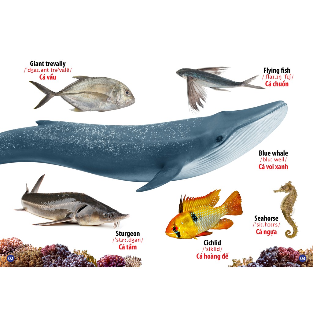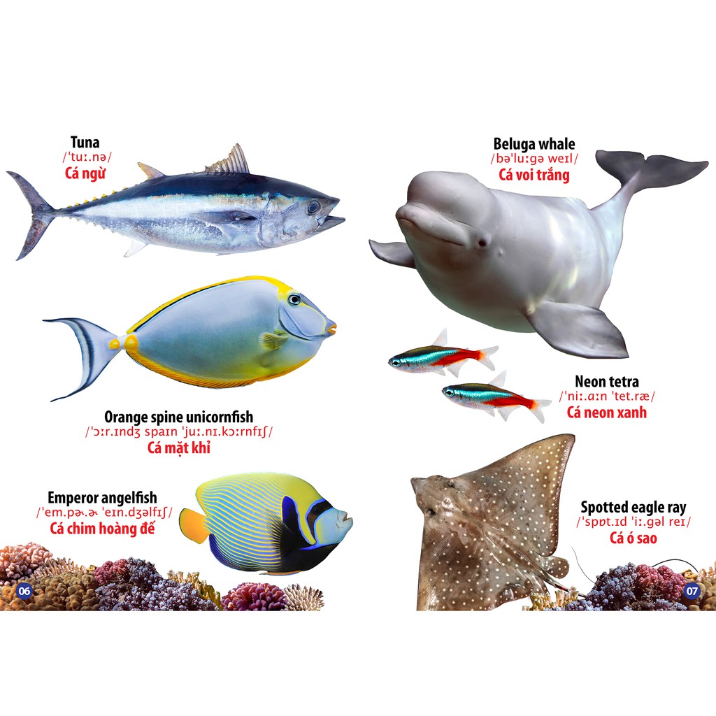 Bé sẽ yêu thích việc học tiếng Anh khi những bài học và hình ảnh minh họa vô cùng lôi cuốn, vì vậy cuốn sách Từ điển bằng hình - Thế giới động vật dưới nước được thiết kế vô cùng sáng tạo, hình ảnh bắt mắt sống động, để truyền tải các bài học một cách sinh động, dễ thương, hấp dẫ tuyệt vời phải không các bé?