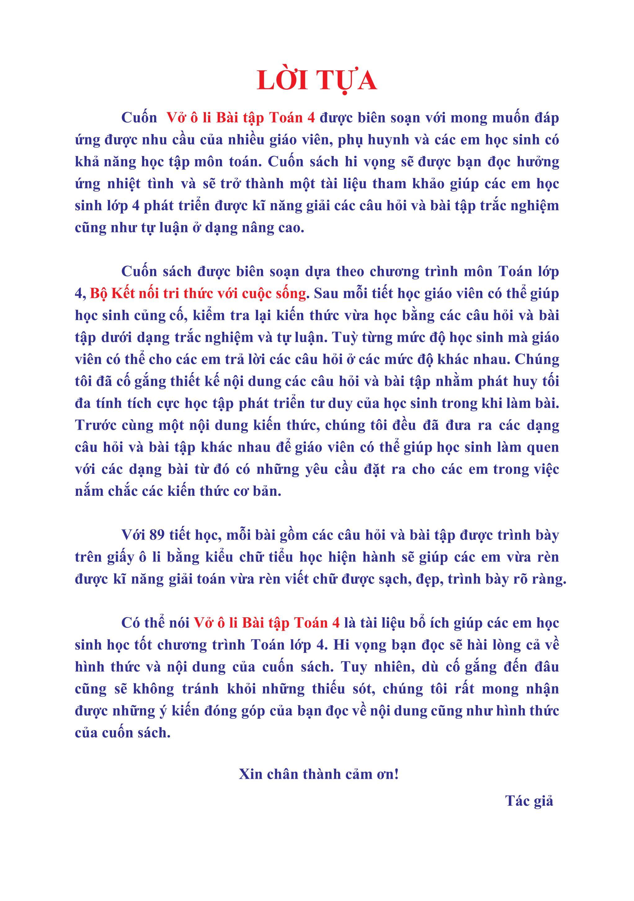 Có thể nói Vở ô li Bài tập Toán 4 là tài liệu bổ ích giúp các em học sinh học tốt chương trình Toán lớp 4. Hi vọng bạn đọc sẽ hài lòng cả về hình thức và nội dung của cuốn sách. Tuy nhiên, dù cố gắng đến đâu cũng sẽ không tránh khỏi những thiếu sót, chúng tôi rất mong nhận được những ý kiến đóng góp của bạn đọc về nội dung cũng như hình thức của cuốn sách.