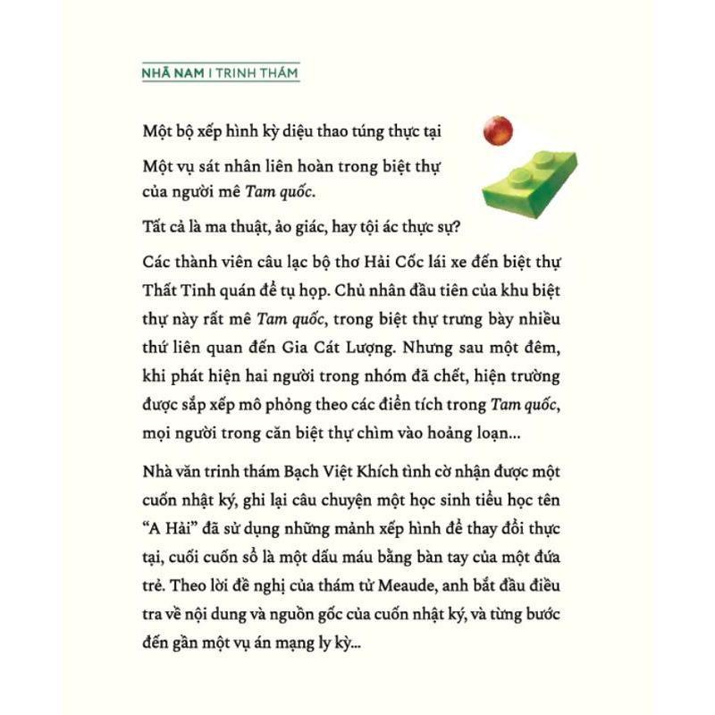 Tác giả: Bạch Nguyệt Hệ Dịch giả: Cao Đức Hiếu Nhà xuất bản: Hà Nội Kích thước: 14.5x20.5 cm Số trang: 420 Ngày phát hành: 2024 Giới thiệu sách Một bộ xếp hình kỳ diệu thao túng thực tại Một vụ s;át nhân liên hoàn trong biệt thự của người mê Tam quốc. Tất cả là m.a th'.uật, ảo giác, hay tội ác thực sự Các thành viên câu lạc bộ thơ Hải Cốc lái xe đến biệt thự Thất Tinh quán để tụ họp. Chủ nhân đầu tiên của khu biệt thự này rất mê Tam quốc, trong biệt thự trưng bày nhiều thứ liên quan đến Gia Cát Lượng. Nhưng sau một đêm, khi phát hiện hai người trong nhóm đã ch/ết, hiện trường được sắp xếp mô phỏng theo các điển tích trong Tam quốc, mọi người trong căn biệt thự chìm vào ho/ảng loạn...