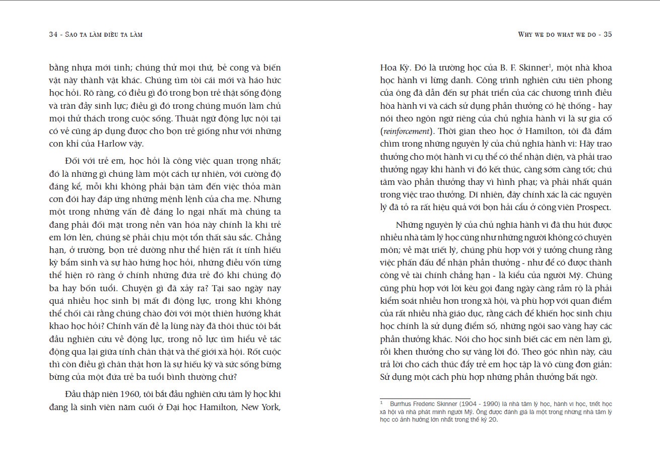 Bắt nguồn từ trăn trở tương tự về việc tự chủ hay bị kiểm soát, Edward L. Deci cùng cộng sự của mình đặt ra câu hỏi: Tại sao trẻ em chào đời với thiên hướng khát khao học hỏi, chúng tò mò và hiếu kỳ với tất cả mọi thứ, thế nhưng tính hiếu kỳ và năng lực học hỏi này dần suy giảm khi bọn trẻ bước vào môi trường học đường? Bằng những nghiên cứu và quan sát của mình, Edward L. Deci đã cho ra đời quyển sách “Sao ta làm điều ta làm”, nhằm giúp giải quyết những trăn trở về động lực thúc đẩy hành vi con người thông qua các nghiên cứu về khía cạnh nền tảng của Tâm lý học hành vi: Động lực.