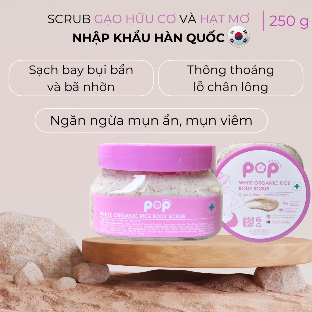 Tẩy Tế Bào Da Chết Gạo Hữu Cơ Sạch Sâu Sáng Mịn POP Làn da của cơ thể chúng ta luôn có cơ chế tự nhiên nhiên là thay thế và phục hồi những tế bào mới liên tục. Tuy nhiên, do nhiều tác động xấu từ bên ngoài như thời tiết, môi trường hay thói quen chăm sóc da không tốt sẽ ảnh hưởng rất nhiều đến hoạt động của cơ chế này. Và nếu bạn không tẩy tế bào chết cho da thường xuyên mỗi tuần thì da sẽ rất khó hấp thụ được những dưỡng chất có trong các sản phẩm chăm sóc da và sẽ gây ra nguy cơ làm bít tắc lỗ chân lông đấy.Vì thế, việc tẩy tế bào da chết thường xuyên và điều đặn sẽ giúp da của bạn sản sinh tế bào da mới thường xuyên, để da luôn được căng bóng, sáng mịn và tràn đầy sức sống. Tẩy tế bào da chết gạo hữu cơ POP rất giàu dưỡng chất từ thiên nhiên như chiết xuất trà xanh, rau má, lô hội, … không chỉ loại bỏ sạch những bụi bẩn, bã nhờn, tế bào da chết mà còn giúp cải thiện làn da của bạn từ sâu bên trong, mang lại làn da mịn màng, tươi sáng và săn chắc. Loại bỏ triệt để tế bào da chết cứng đầu, mụn đầu đen, mụn cám. Làm sạch bụi bẩn và bã nhờn trên da, giúp thông thoáng lỗ chân lông, ngăn ngừa nguy cơ bị mụn ẩn, mụn viêm. Thúc đẩy sự phát triển, tái sinh của mô da, kích thích tăng sinh collagen, mang lại làn da hồng hào, săn chắc. Cân bằng độ ẩm của da, thành phần kháng viêm và chống ôxi hoá nguồn gốc tự nhiên bảo vệ da khỏi tác hại từ tia UV và môi trường xung quanh. Thành phần chính: