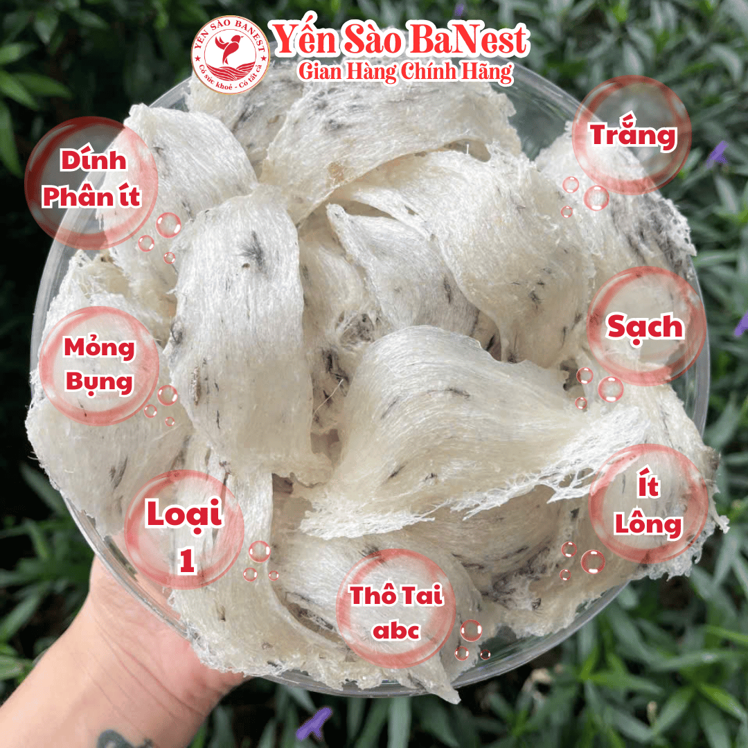 - Yến có màu trắng ngà , 100gr (10-12 tổ), tỉ lệ sợi 80% -ruột 20% trong 1 tổ yến hoặc 100 % sợi trong 1 tổ Yến tuỳ phân loại Cam kết từ Banest