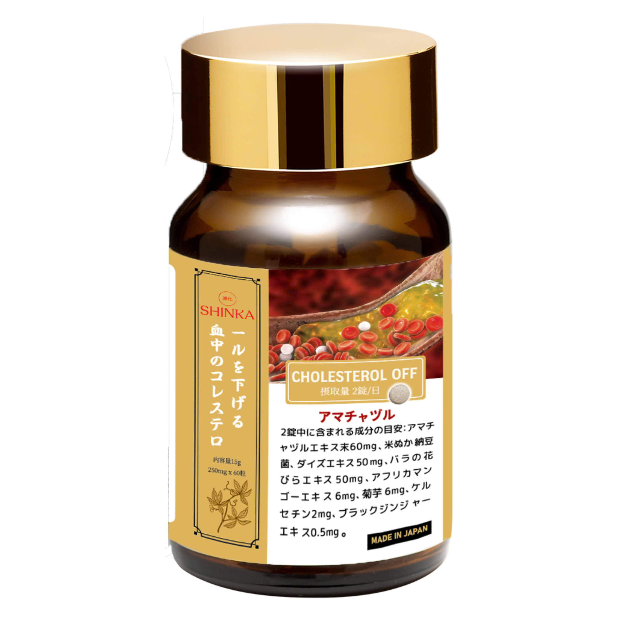 Sản phẩm Shinka – CHOLESTEROL OFF lọ 60 viên của công ty Growbis được tổng hợp từ những nguyên liệu thiên nhiên của Nhật Bản như Giảo Cổ Lam, đậu nành lên men với Natto, cánh hoa hồng, gạo đỏ... thông qua công nghệ bào chế và sản xuất của nhà máy Powerful Health Foods Company Limited 215-1 Hiraoka, Kamiminochigun Shinanomachi, Nagano 389-1315, Japan