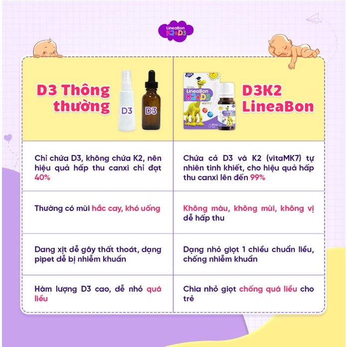Vitamin LineaBon K2 D3 (10ml) là sản phẩm D3 nhỏ giọt chứa MK7 từ Châu Âu đầu tiên tại Việt Nam, giải quyết nhanh chóng tình trạng còi xương và giúp phát triển chiều cao vượt trội. Vitamin K2 trong Lineabon ở dạng MK7 chiết xuất tự nhiên từ Natto Nhật Bản kết hợp với các phân tử D3 dưới dạng bao vi nang siêu nhỏ mịn có tính ổn định cao đem lại độ sinh khả dụng tối đa, hiệu quả hấp thu lên tới 99% thích hợp cho cả những trẻ có cơ địa khó hấp thu canxi.