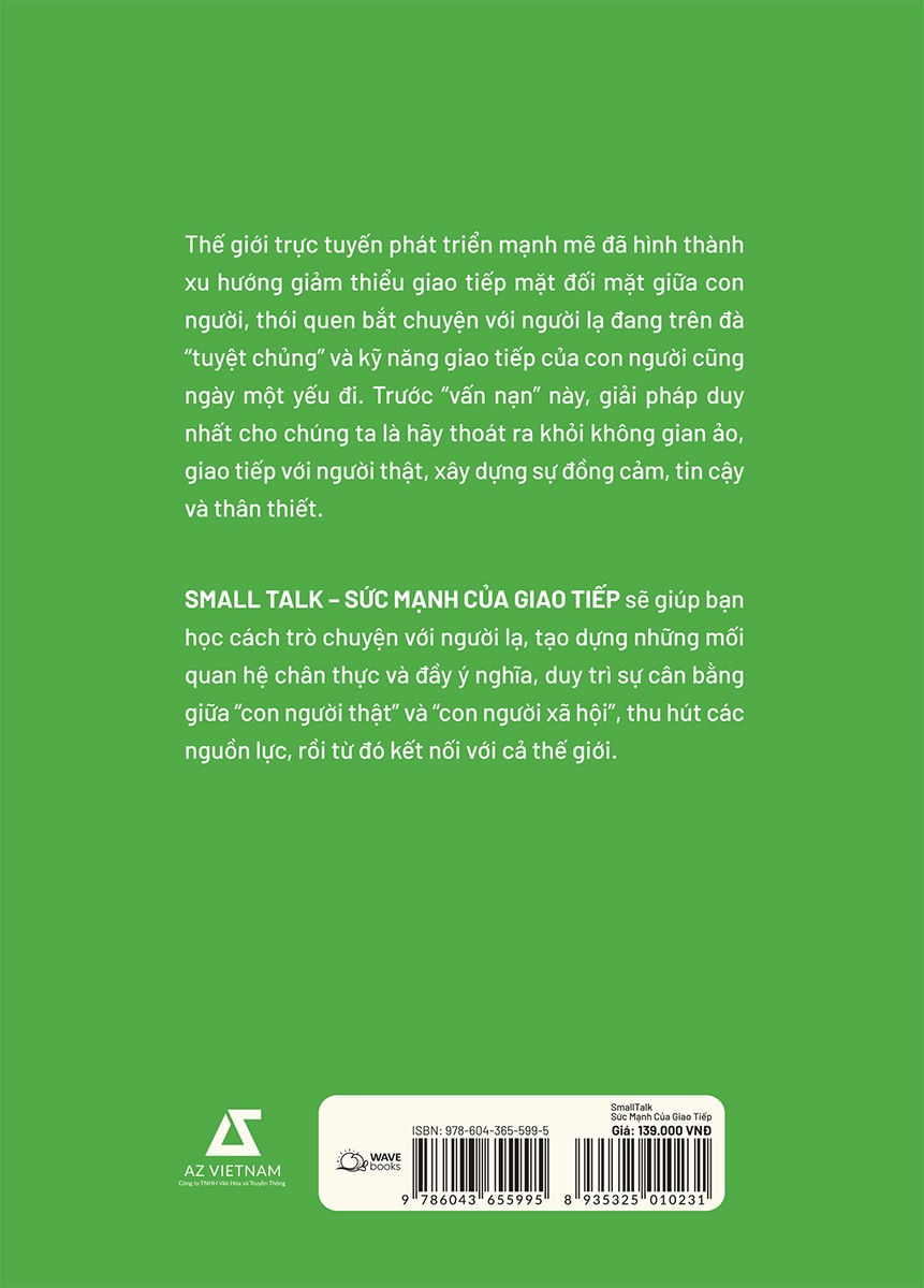 SMALL TALK - SỨC MẠNH CỦA GIAO TIẾP Sự bùng nổ của công nghệ số, sự phát triển của mạng xã hội và các hình thức liên lạc khác đã vô tình thay đổi cách con người giao tiếp với nhau. Giờ đây, nhiều người sợ hãi trước các cuộc gặp gỡ và chỉ cảm thấy an toàn khi trò chuyện thông qua một lớp màn hình. Tình trạng này đang khiến việc bắt chuyện, “tâm sự cùng người lạ” trở nên xa vời và gần như tuyệt chủng, kỹ năng giao tiếp của con người cũng ngày càng suy yếu. Trên thực tế, việc giao tiếp với người khác là một trong những điều kiện cần để duy trì một xã hội chuẩn mực, một trạng thái tinh thần cân bằng và một mạng lưới mối quan hệ tác động không nhỏ đến thành công của một người. Ngoài ra, giao tiếp mặt đối mặt cũng là cách để con người cởi mở và thấu hiểu nhau thông qua hành vi và biểu cảm trong vô thức, vốn không thể được biểu lộ qua dòng tin nhắn hay những icon. Để thoát khỏi “vấn nạn” lặng câm trước người lạ này, giải pháp duy nhất là hiên ngang bước ra khỏi thế giới ảo, học cách trò chuyện với nhiều kiểu người khác nhau, xây dựng sự đồng cảm, tin cậy và thân thiết. Nếu bạn đang loay hoay không biết mở cánh cửa của thế giới thực, bạn có thể tìm đến SMALL TALK - SỨC MẠNH CỦA GIAO TIẾP như một chiếc chìa khoá vạn năng. Cuốn sách được chia thành 3 phần lớn với nội dung xoay quanh cách sử dụng Small Talk - những đoạn hội thoại vô thưởng vô phạt để chủ động bắt chuyện với người lạ - kết giao với người lạ - mở rộng mạng lưới quan hệ. Cuốn sách này sẽ cho bạn thấy rằng chúng ta hoàn toàn có thể loại bỏ những rắc rối do kỹ năng trò chuyện xã giao kém gây ra. Hãy để cuốn sách đồng hành với bạn mỗi ngày, bắt đầu bằng một câu gợi chuyện và sử dụng kỹ năng small talk để tạo ra nhiều kết nối có ý nghĩa hơn. Sách được phát hành bởi thương hiệu sách trẻ Wavebooks với sứ mệnhtrở thành người bạn đồng hành tin cậy cho quá trình phát triển kỹ năng và tâm hồn người Việt trẻ.