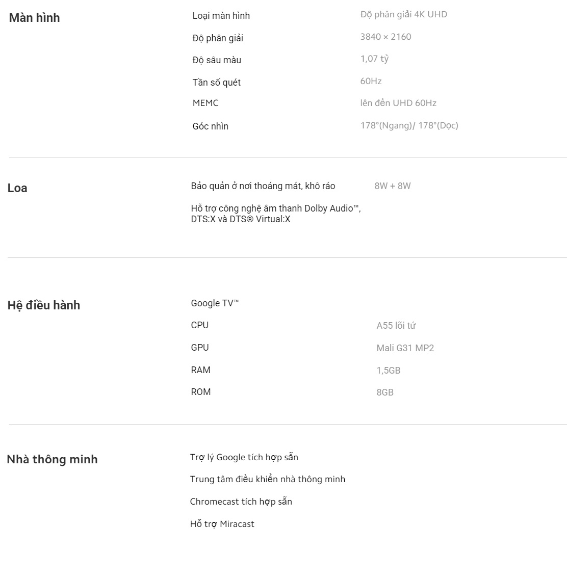 - ​Tổng quan sản phẩm - Loại Tivi:Google Tivi - Kích cỡ màn hình:55 Inch - Độ phân giải:4K (Ultra HD) - Hệ điều hành:Google TV - Công nghệ hình ảnh - Công nghệ hình ảnh - Dolby Vision IQ - HDR 10+ - Imax enhanced - Free sync - Filmmaker - Bộ xử lý:Cortex-A73*4 - Công nghệ âm thanh - Tổng công suất loa:25W (2 X 12.5W) - Số lượng loa:2 - Âm thanh vòm - Dolby Audio - Dolby Atmos 1 - DTS-X - Cổng kết nối -