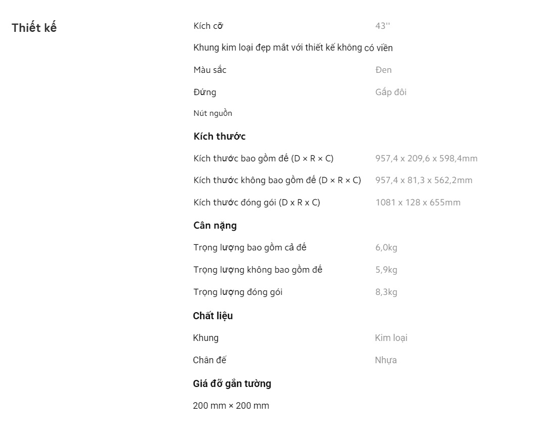 ông số cơ bản - Xuất xứ: Việt Nam ông số kỹ thuật - Dòng sản phẩm: 6600 - Kích thước màn hình (inches): 43 - Độ phân giải: 3840*2160 - Góc nhìn:160/150 - HDR