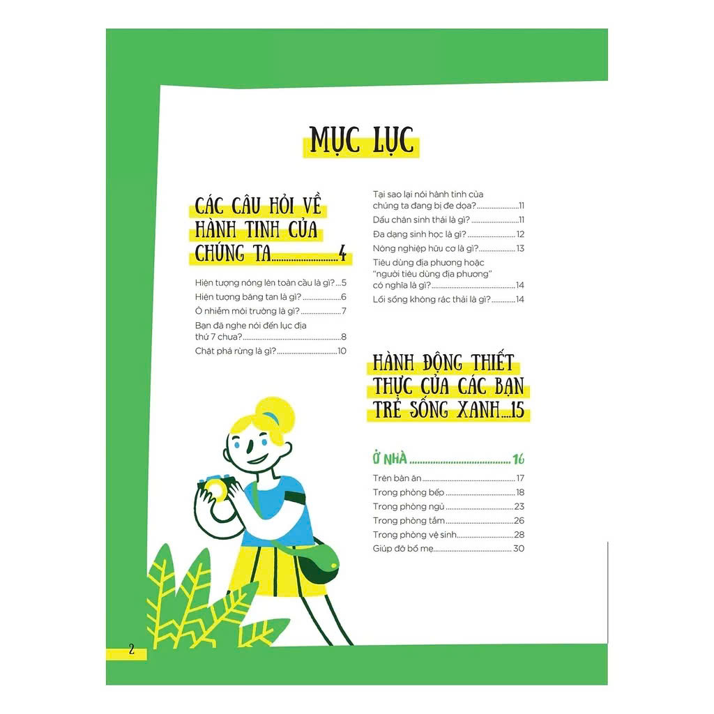 Độc giả nhí sẽ tìm hiểu về những hành động hằng ngày nhằm làm giảm dấu chân sinh thái và hướng tới mục tiêu không rác thải; các hoạt động dựa trên sự quan sát để hiểu rõ hơn về thiên nhiên, cụ thể như: làm quả bom hạt giống, làm nơi trú ẩn cho côn trùng, tự làm túi vải thô, chế tạo chất tẩy rửa dùng cho nhiều bề mặt