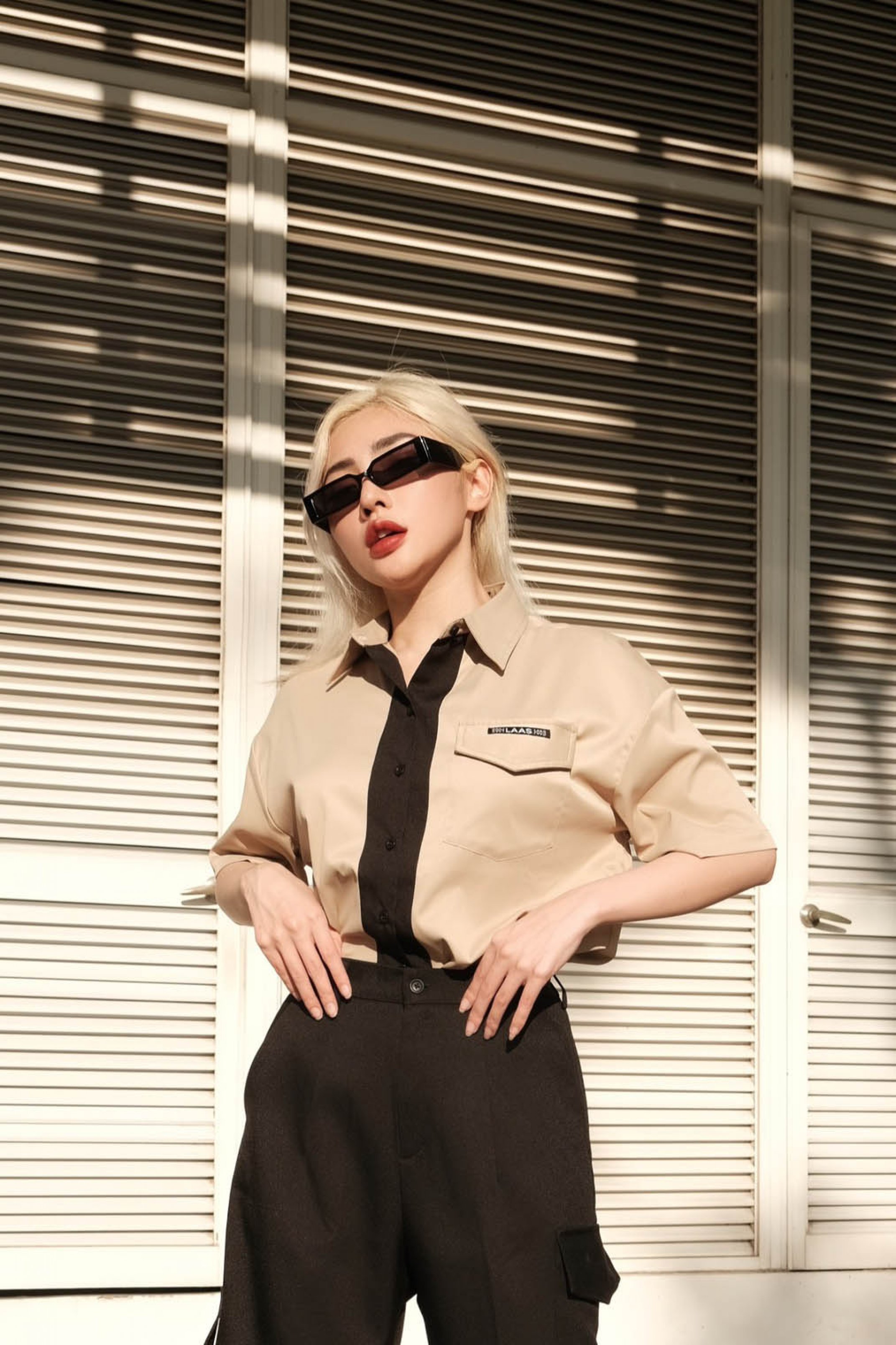 ĐIỂM PHẤN PHẦN PHỐI KẺ SỌC GIỮA TRƯỚC NẸP ÁO, VÀ GIỮA SAU THÂN ÁO PHÍA SAU PHẦN PHỐI SỌC CÓ GẮN TAG LOGO LAAS