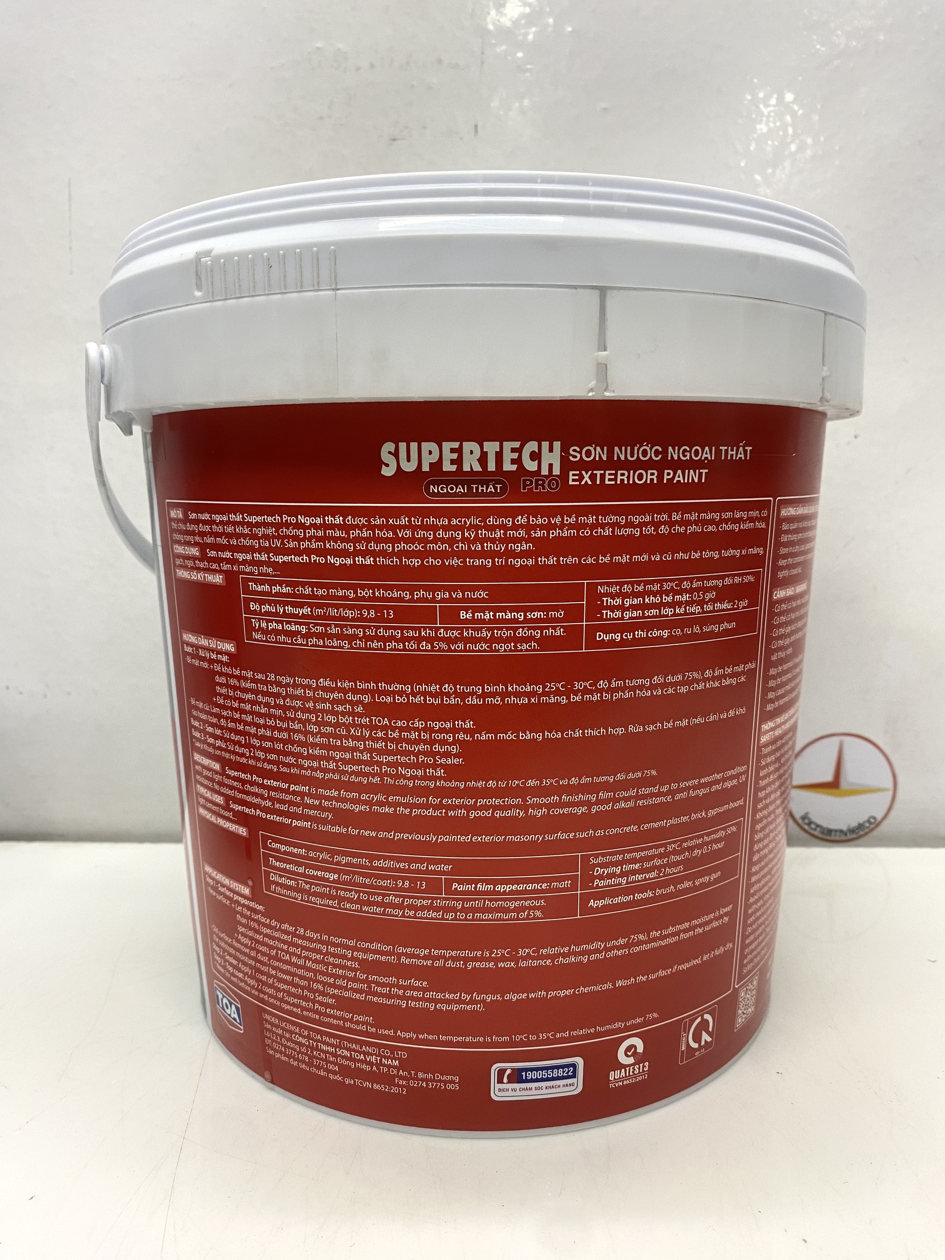 Không chứa Phoóc-môn, Chì  MỤC ĐÍCH SỬ DỤNG: Sơn Nước ToaSupertech Pro Ngoại thất thích hợp sử dụng trên các bề mặt tường, bê tông, thạch cao, gạch..  ĐẶC TÍNH SẢN PHẨM: · Thành phần cấu tạo: Chất tạo màng, bột khoáng, phụ gia & nước. · Màu sắc: Nhiều màu Theo bảng màu và quạt màu TOA · Bề mặt hoàn thiện: Mờ · Thể tích chất rắn: 39 ± 2 (% theo thể tích) · Độ phủ lý thuyết: 9.8 – 13 m2/lít/lớp Độ phủ thực tế sẽ phụ thuộc vào khả năng dàn trải của màng sơn, độ dày màng sơn khô, bề mặt thi công, tay nghề thợ sơn và lượng sơn hao hụt thực tế khi thi công. ·Hàm lượng chất hữu cơ bay hơi (VOCs): ≤ 50 g/L  Thời gian khô ở nhiệt độ 30 oC: khô bề mặt 30 phút ; khô cứng:4h  Đóng gói: 18 lít; 5 lít Dụng cụ: Cọ, ru-lô/con lăn, súng phun sơn thông thường Tỷ lệ pha loãng:Sơn sẵn sàng sử dụng sau khi được khuấy trộn đồng nhất. Nếu có nhu cầu pha loãng, chỉ nên pha tối đa 5% với nước ngọt sạch. HƯỚNG DẪN THI CÔNG:   Bước 1: - Xử lý bề mặt: Bề mặt mới: