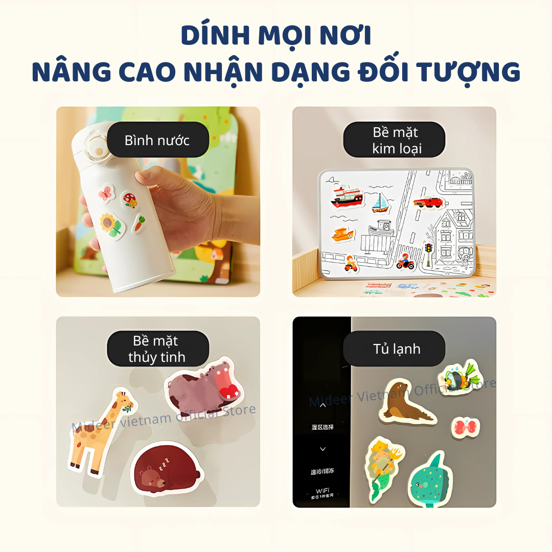 - DÍNH MỌI NƠI, NÂNG CAO NHẬN DẠNG ĐỐI TƯỢNG- Với các hình ảnh đa dạng về đồ vật hàng ngày, trẻ học từ vựng theo chủ đề một cách trực quan và dễ nhớ. Các miếng dán có thể dính trên nhiều bề mặt nhẵn, mở ra không gian sáng tạo vô hạn cho trẻ.