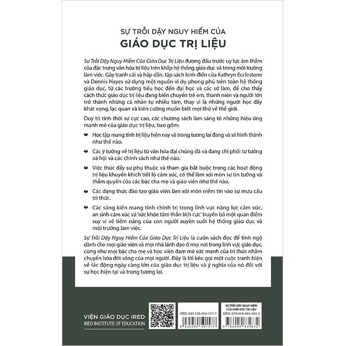 Sự Trỗi Dậy Nguy Hiểm Của Giáo Dục Trị Liệu Sự Trỗi Dậy Nguy Hiểm Của Giáo Dục Trị Liệu đương đầu trước uy lực âm thầm của đặc trưng văn hóa trị liệu trên khắp hệ thống giáo dục và trong môi trường làm việc. Gây tranh cãi và hấp dẫn, tập sách kinh điển của Kathryn Ecclestone và Dennis Hayes sử dụng một nguồn ví dụ phong phú trên toàn hệ thống giáo dục, từ các trường tiểu học đến đại học và các sở làm, để cho thấy cách thức giáo dục trị liệu đang biến chuyển trẻ em, thanh niên và người lớn trở thành những cá nhân tự nhiễu tâm, thay vì là những người học đầy khát vọng, lạc quan và kiên cường muốn biết mọi thứ về thế giới.