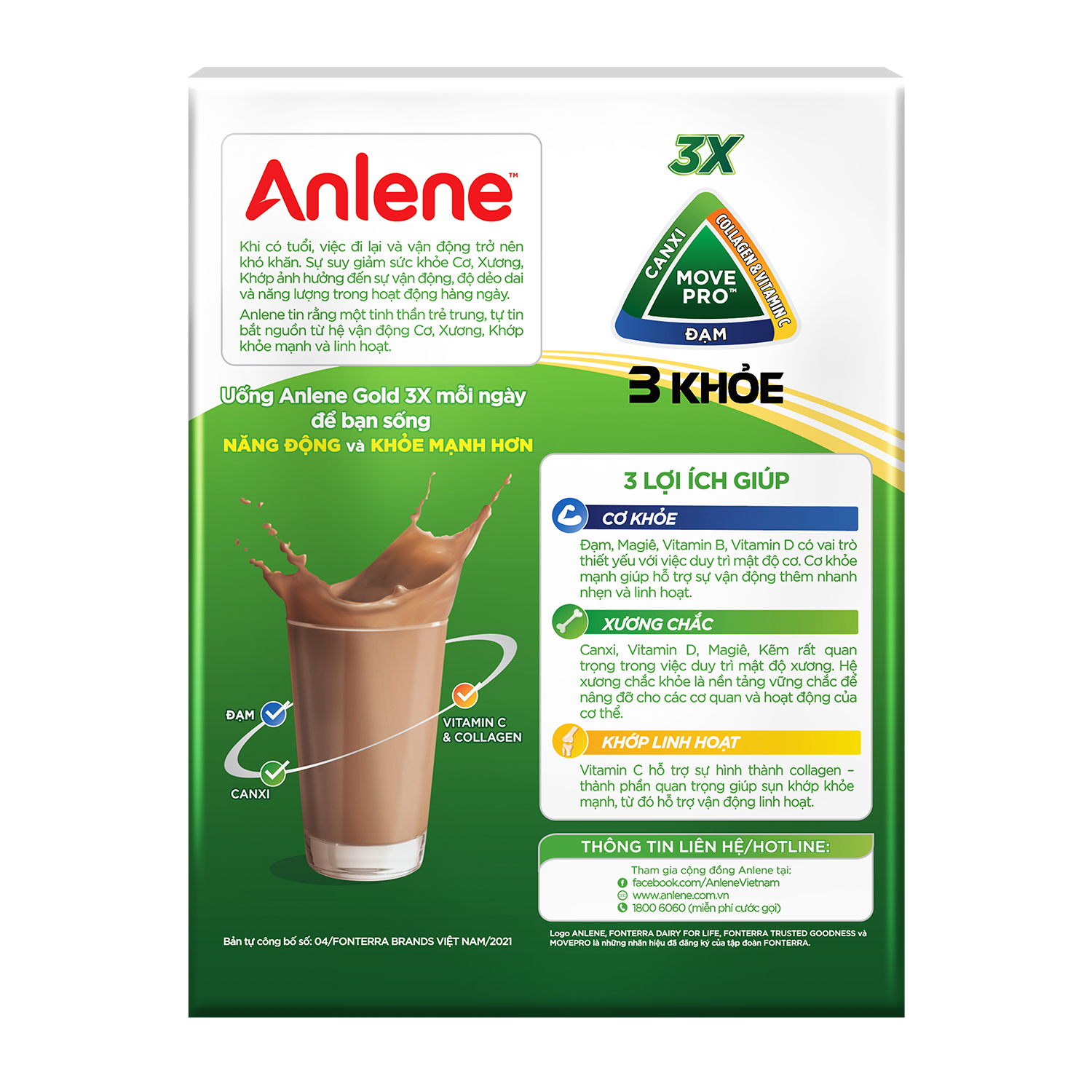 - Anlene Gold 3X/Anlene 3 Khoẻ mới là sản phẩm sữa chứa nhiều dưỡng chất thiết yếu hỗ trợ hệ Cơ-Xương-Khớp khỏe mạnh.